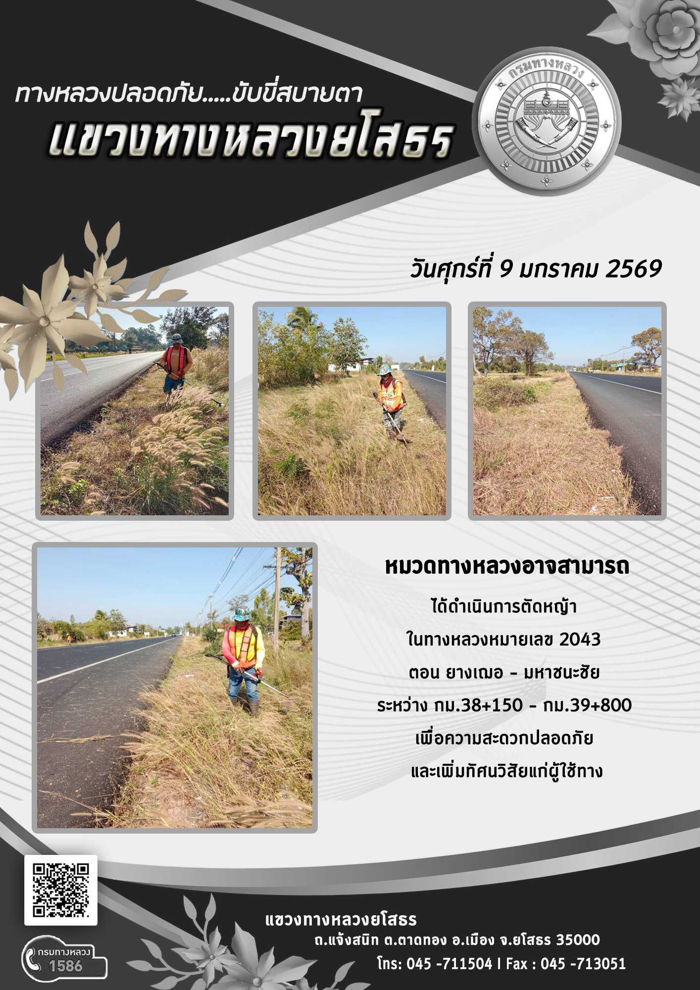 วันศุกร์ที่ 9 มกราคม 2569 หมวดทางหลวงอาจสามารถ ได้ดำเนินการตัดหญ้า ในทางหลวงหมายเลข 2043 ตอน ยางเฌอ - มหาชนะชัย ระหว่าง กม.38+150 - กม.39+800 เพื่อความสะดวกปลอดภัย และเพิ่มทัศนวิสัยแก่ผู้ใช้ทาง