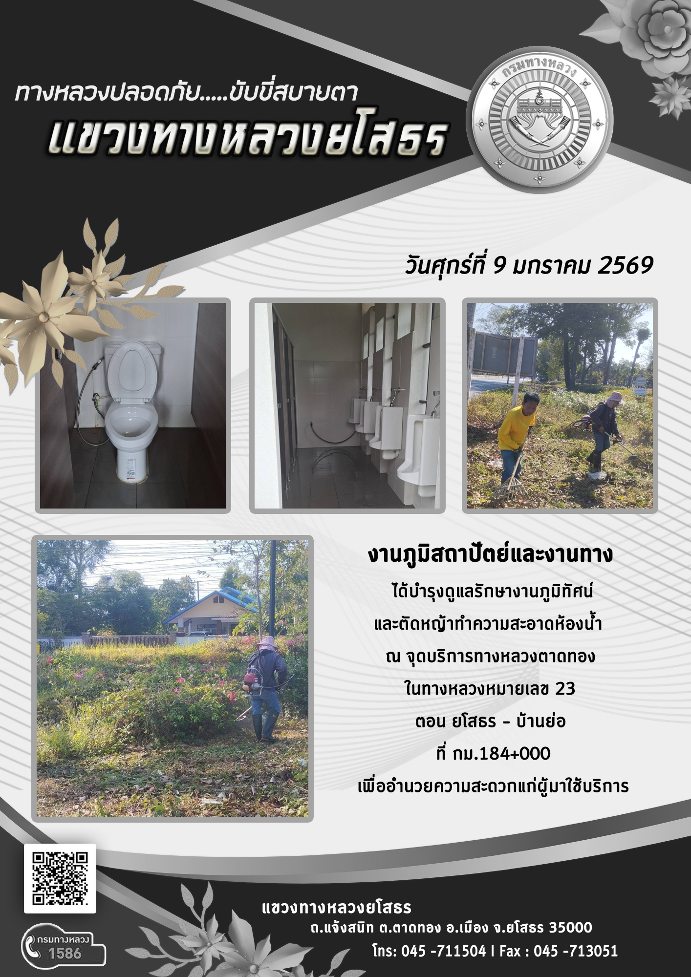 วันศุกร์ที่ 9 มกราคม 2569 งานภูมิสถาปัตย์และงานทาง ได้บำรุงดูแลรักษางานภูมิทัศน์ และตัดหญ้าทำความสะอาดห้องน้ำ ณ จุดบริการทางหลวงตาดทอง ในทางหลวงหมายเลข 23 ตอน ยโสธร - บ้านย่อ ที่ กม.184+000 เพื่ออำนวยความสะดวกแก่ผู้มาใช้บริการ