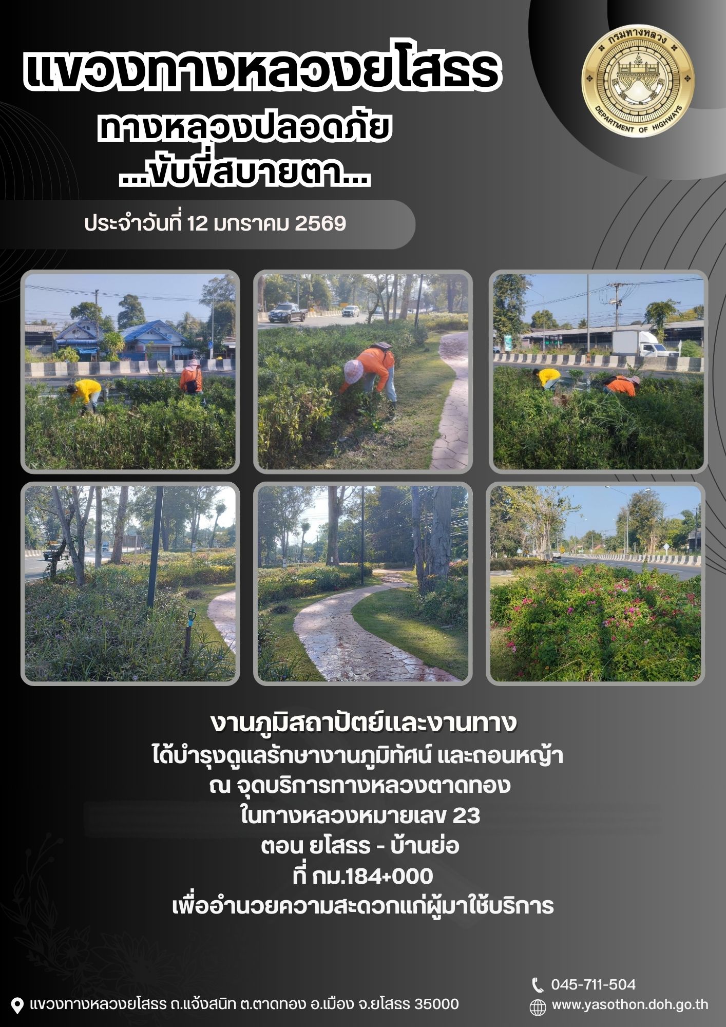 วันที่ 12 มกราคม 2569 งานภูมิสถาปัตย์และงานทาง ได้บำรุงดูแลรักษางานภูมิทัศน์ และถอนหญ้า ณ จุดบริการทางหลวงตาดทอง ในทางหลวงหมายเลข 23 ตอน ยโสธร - บ้านย่อ ที่ กม.184+000 เพื่ออำนวยความสะดวกแก่ผู้มาใช้บริการ