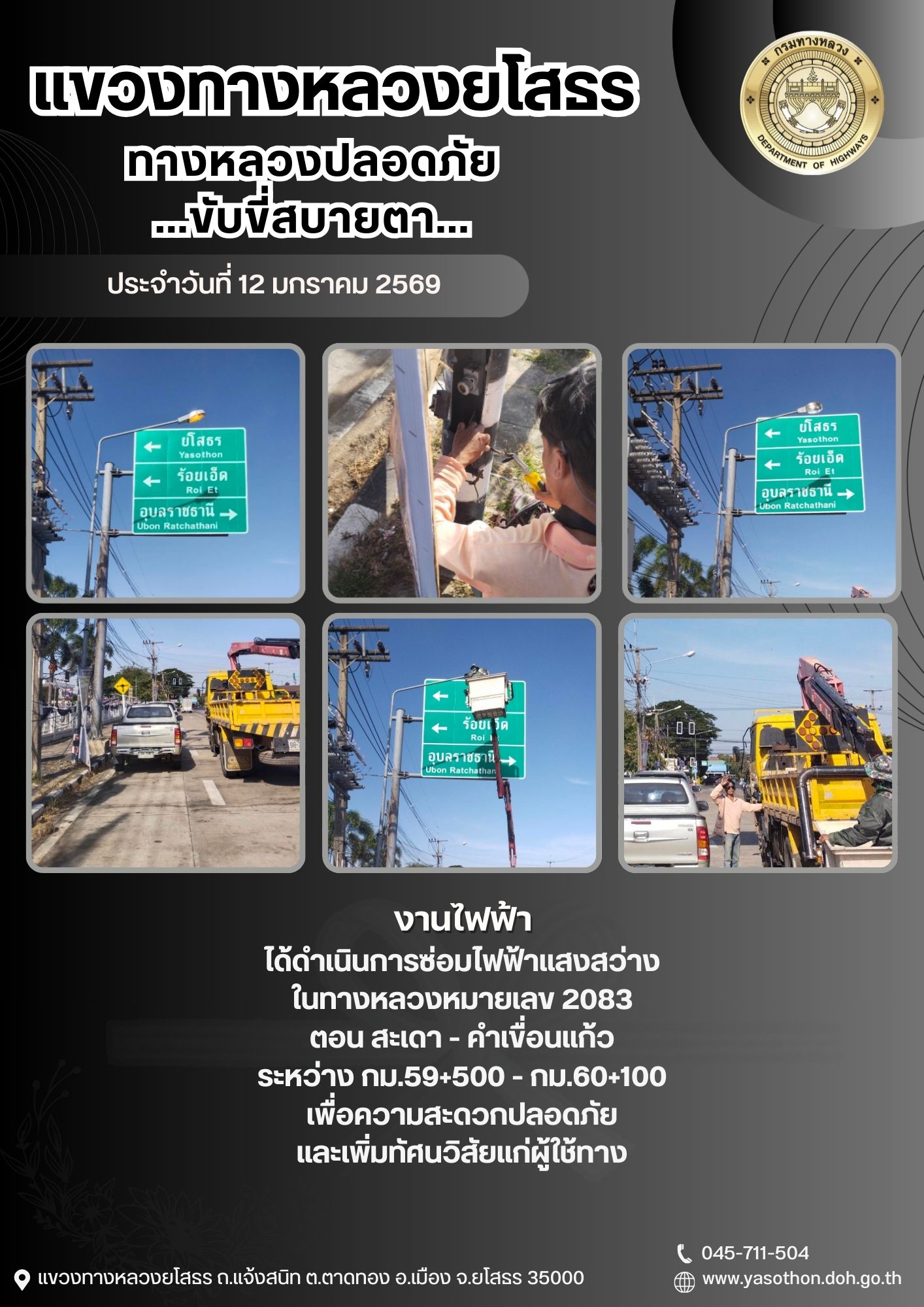 วันที่ 12 มกราคม 2569 งานไฟฟ้า ได้ดำเนินการซ่อมไฟฟ้าแสงสว่าง ในทางหลวงหมายเลข 2083 ตอน สะเดา - คำเขื่อนแก้ว ระหว่าง กม.59+500 - กม.60+100 เพื่อความสะดวกปลอดภัย และเพิ่มทัศนวิสัยแก่ผู้ใช้ทาง