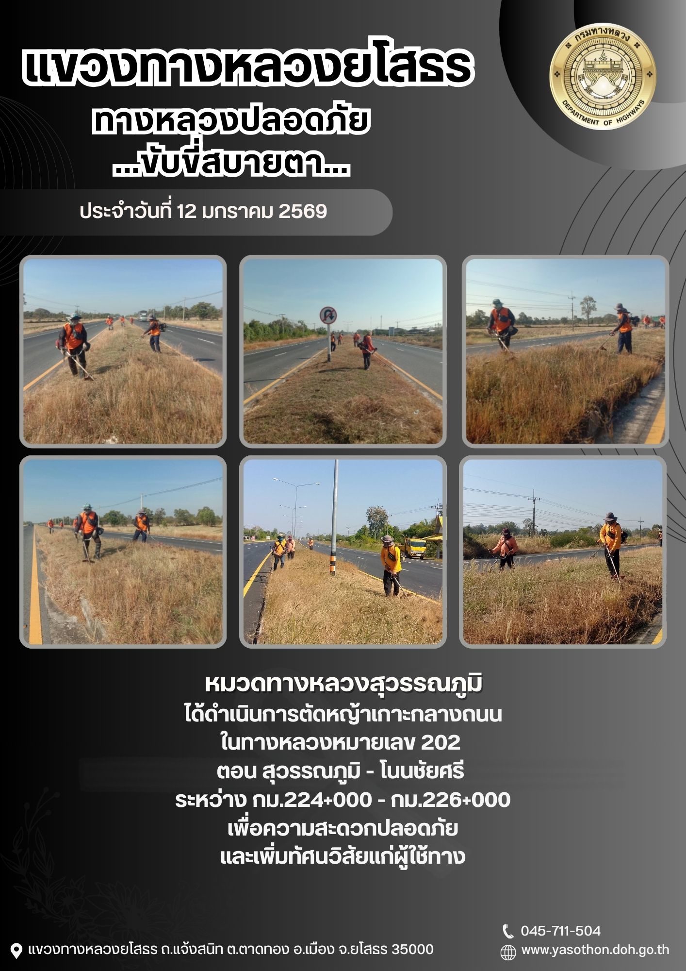วันที่ 12 มกราคม 2569 หมวดทางหลวงสุวรรณภูมิ ได้ดำเนินการตัดหญ้าเกาะกลางถนน ในทางหลวงหมายเลข 202 ตอน สุวรรณภูมิ - โนนชัยศรี ระหว่าง กม.224+000 - กม.226+000 เพื่อความสะดวกปลอดภัย และเพิ่มทัศนวิสัยแก่ผู้ใช้ทาง
