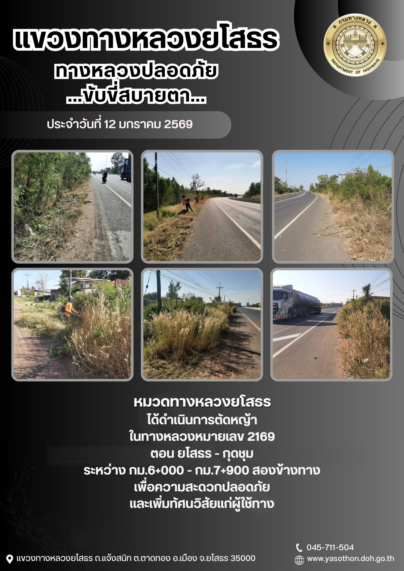 วันที่ 12 มกราคม 2569 หมวดทางหลวงยโสธร ได้ดำเนินการตัดหญ้า ในทางหลวงหมายเลข 2169 ตอน ยโสธร - กุดชุม ระหว่าง กม.6+000 - กม.7+900 สองข้างทาง เพื่อความสะดวกปลอดภัย และเพิ่มทัศนวิสัยแก่ผู้ใช้ทาง