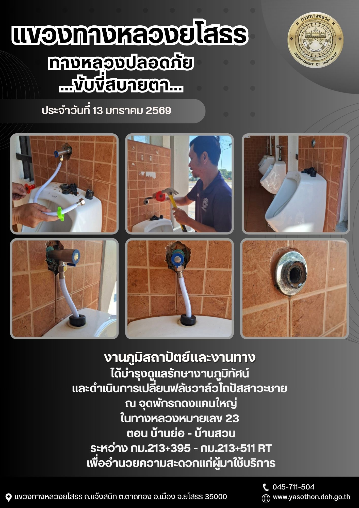 วันที่ 13 มกราคม 2569 งานภูมิสถาปัตย์และงานทาง ได้บำรุงดูแลรักษางานภูมิทัศน์ และดำเนินการเปลี่ยนวาล์วโถปัสสาวะชาย ณ จุดพักรถดงแคนใหญ่ ในทางหลวงหมายเลข 23 ตอน บ้านย่อ - บ้านสวน ระหว่าง กม.213+395 - กม.213+511 RT เพื่ออำนวยความสะดวกแก่ผู้มาใช้บริการ