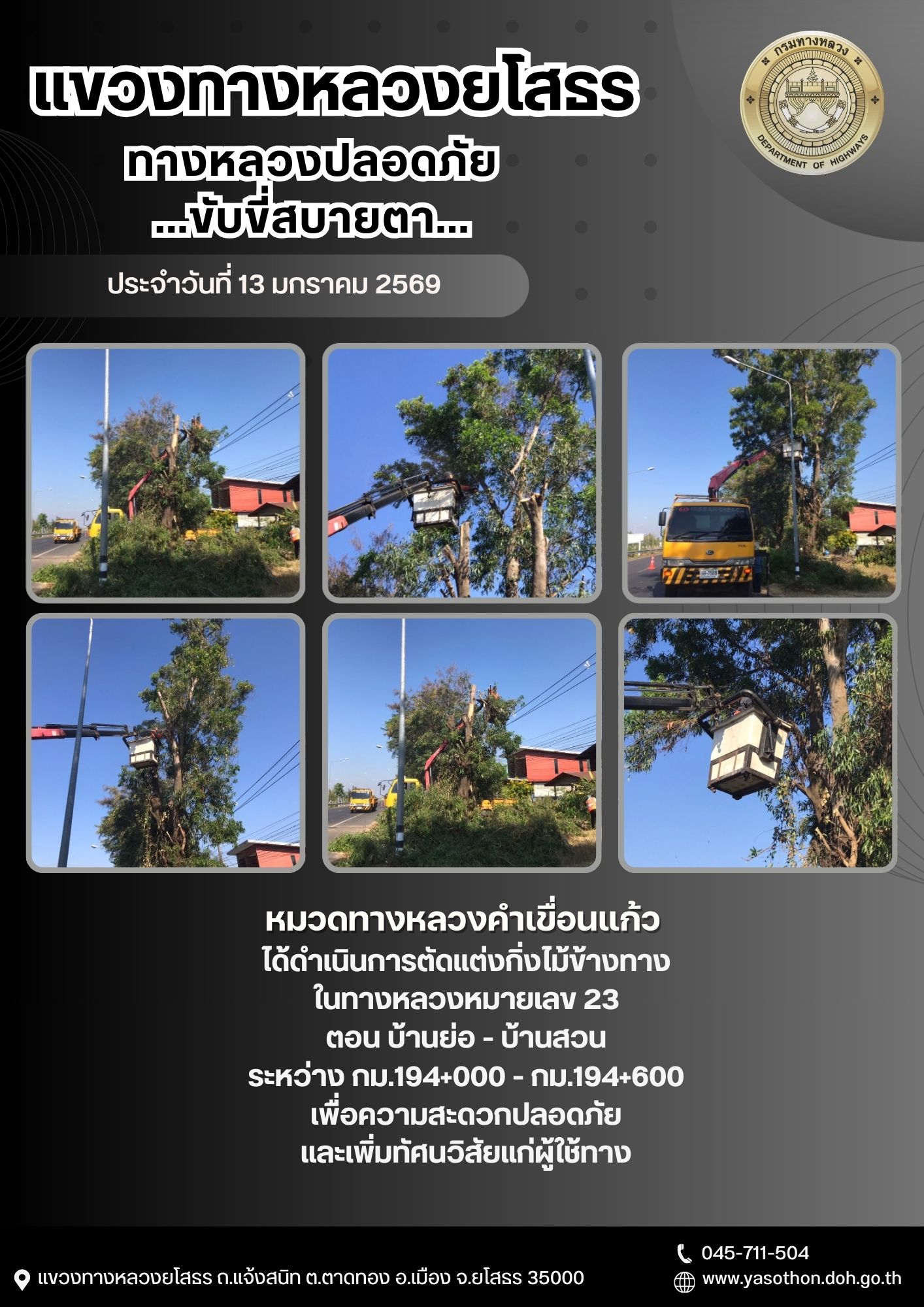 วันที่ 13 มกราคม 2569 หมวดทางหลวงคำเขื่อนแก้ว ได้ดำเนินการตัดแต่งกิ่งไม้ข้างทาง ในทางหลวงหมายเลข 23 ตอน บ้านย่อ - บ้านสวน ระหว่าง กม.194+000 - กม.194+600 เพื่อความสะดวกปลอดภัย และเพิ่มทัศนวิสัยแก่ผู้ใช้ทาง
