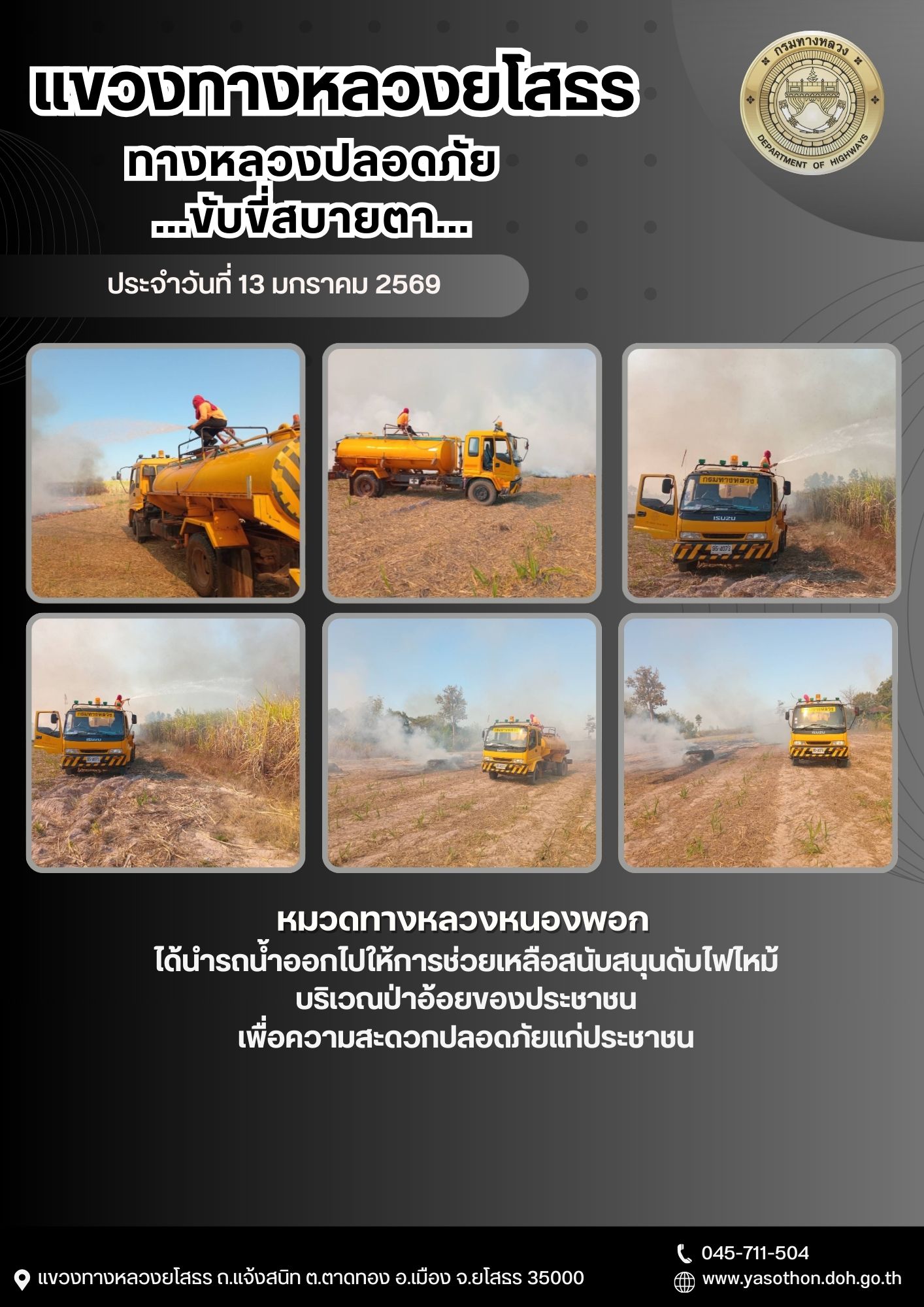 วันที่ 13 มกราคม 2569 หมวดทางหลวงหนองพอก ได้นำรถน้ำออกไปให้การช่วยเหลือสนับสบสนุนดับไฟไหม้ บริเวณป่าอ้อยของประชาชน เพื่อความสะดวกปลอดภัยแก่ประชาชน