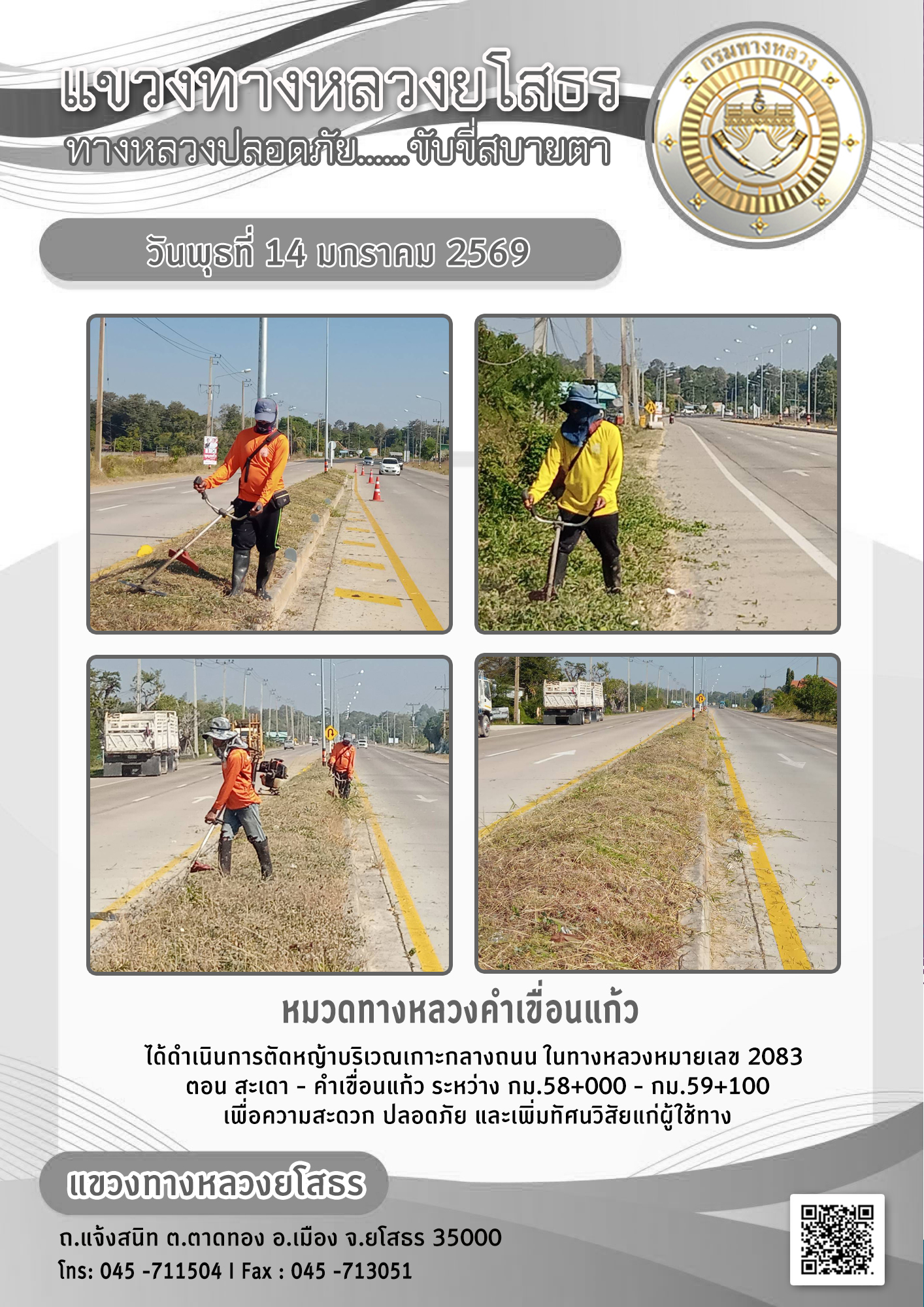 - [10:21] ทั่วไป วันอังคารที่ 31 มีนาคม 2569 งานอำนวยความปลอดภัย ได้ดำเนินการตัดหญ้า ทำความสะอาดภายในบริเวณแขวงทางหลวงยโสธร