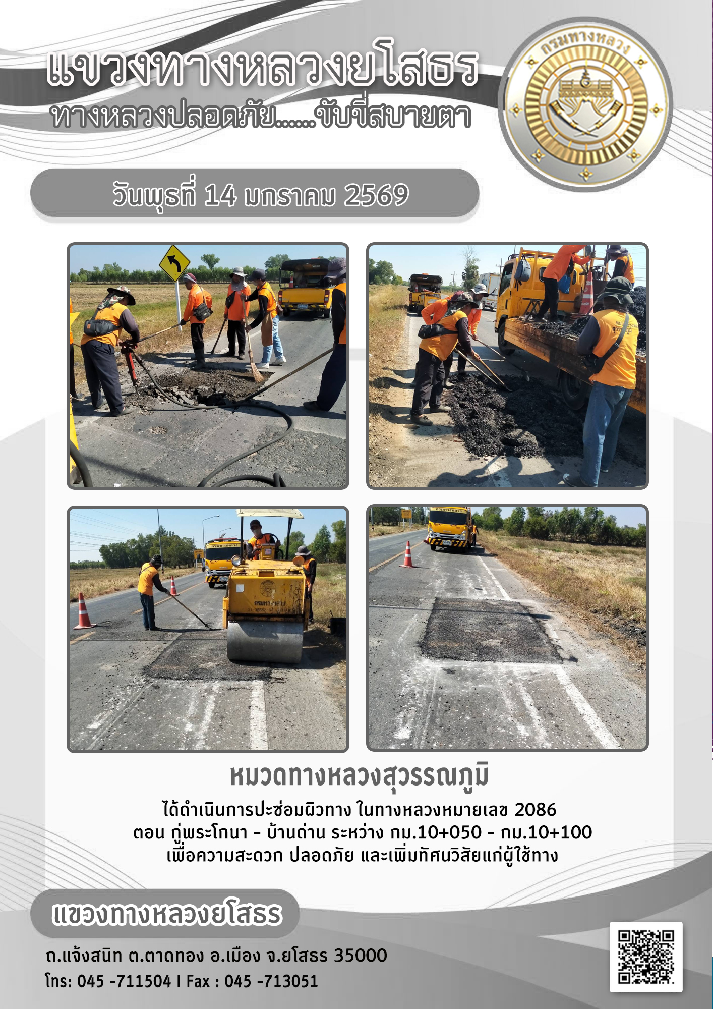 วันพุธที่ 14 มกราคม 2569 หมวดทางหลวงสุวรรณภูมิ ได้ดำเนินการปะซ่อมผิวทาง ในทางหลวงหมายเลข 2086 ตอน กู่พระโกนา - บ้านด่าน ระหว่าง กม.10+050 - กม.10+100 เพื่อความสะดวก ปลอดภัย และเพิ่มทัศนวิสัยแก่ผู้ใช้ทาง