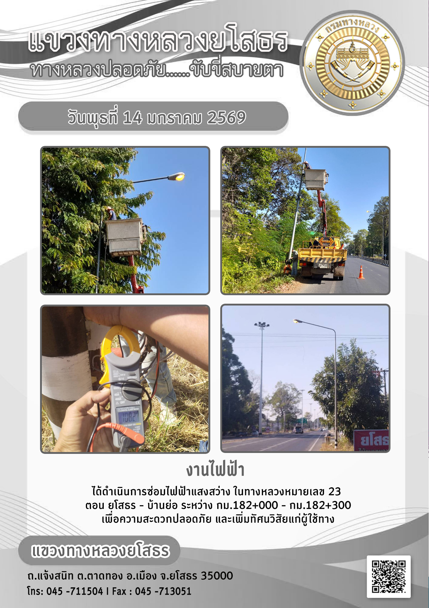 วันพุธที่ 14 มกราคม 2569 งานไฟฟ้า ได้ดำเนินการซ่อมไฟฟ้าแสงสว่าง ในทางหลวงหมายเลข 23 ตอน ยโสธร - บ้านย่อ ระหว่าง กม.182+000 - กม.182+300 เพื่อความสะดวกปลอดภัย และเพิ่มทัศนวิสัยแก่ผู้ใช้ทาง