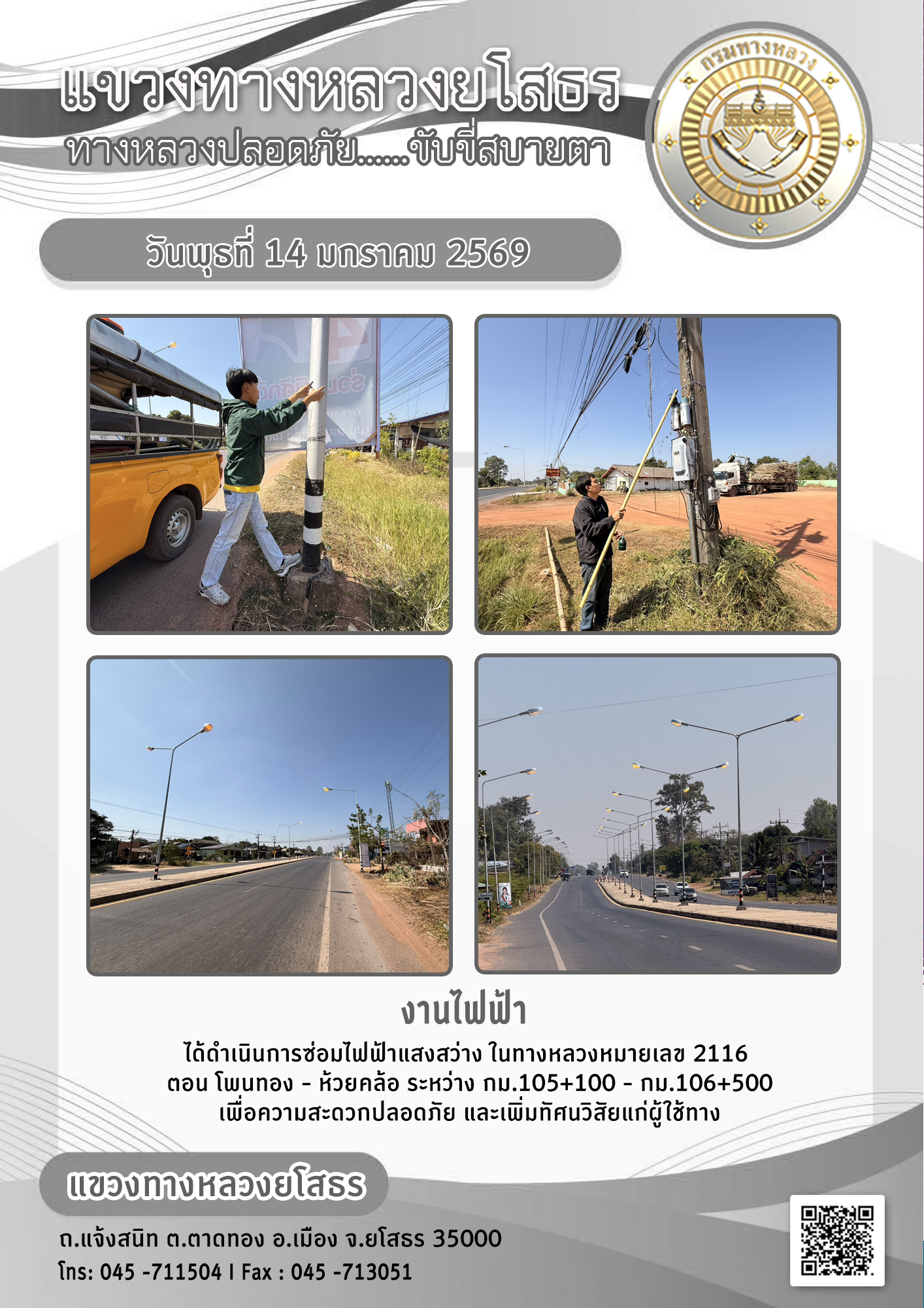 วันพุธที่ 14 มกราคม 2569 งานไฟฟ้า ได้ดำเนินการซ่อมไฟฟ้าแสงสว่าง ในทางหลวงหมายเลข 2116 ตอน โพนทอง - ห้วยคล้อ ระหว่าง กม.105+100 - กม.106+500 เพื่อความสะดวกปลอดภัย และเพิ่มทัศนวิสัยแก่ผู้ใช้ทาง
