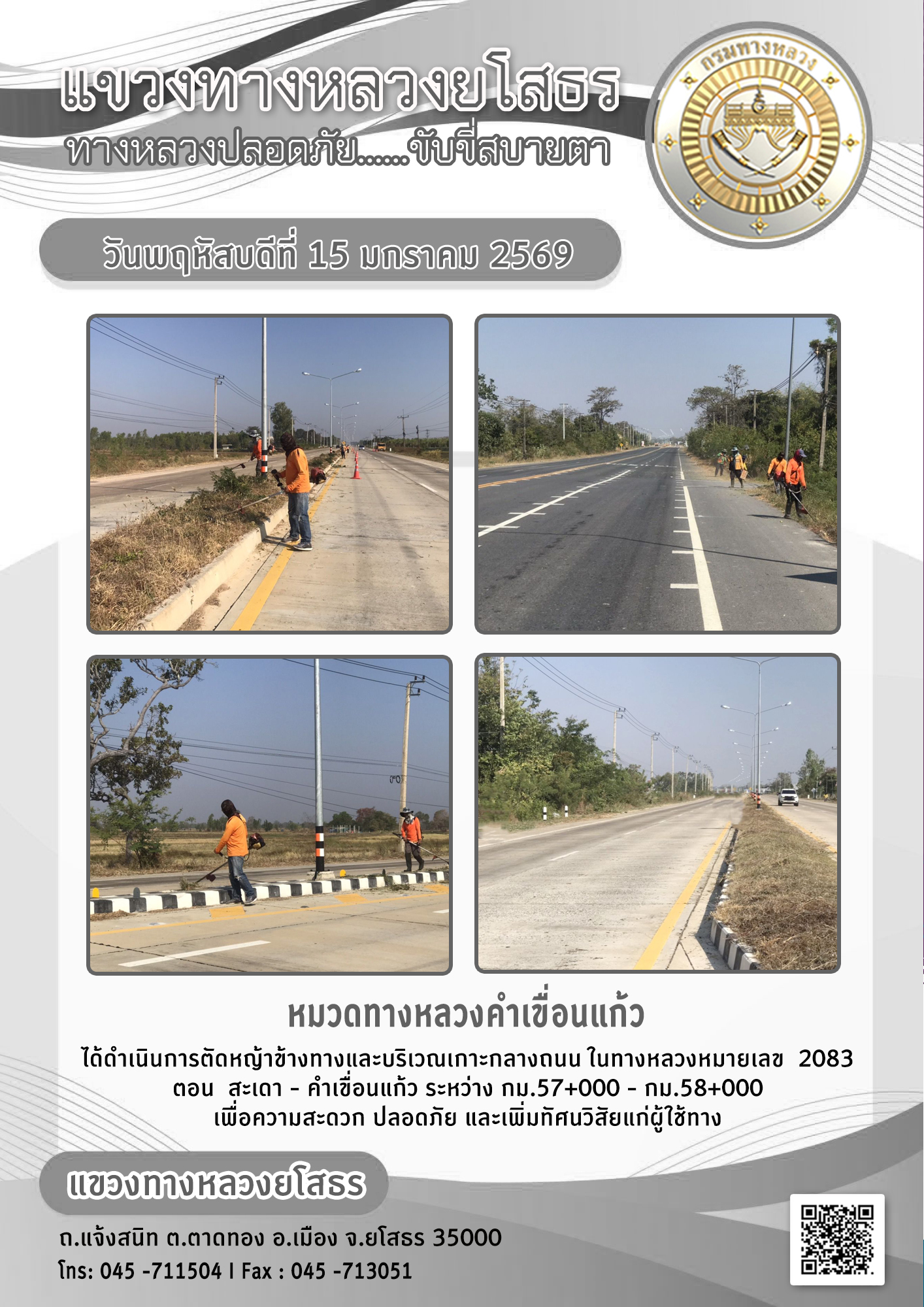 วันพฤหัสบดีที่ 15 มกราคม 2569 หมวดทางหลวงคำเขื่อนแก้ว ได้ดำเนินการตัดหญ้าข้างทางและบริเวณเกาะกลางถนน ในทางหลวงหมายเลข 2083 ตอน สะเดา - คำเขื่อนแก้ว ระหว่าง กม.57+000 - กม.58+000 เพื่อความสะดวก ปลอดภัย และเพิ่มทัศนวิสัยแก่ผู้ใช้ทาง