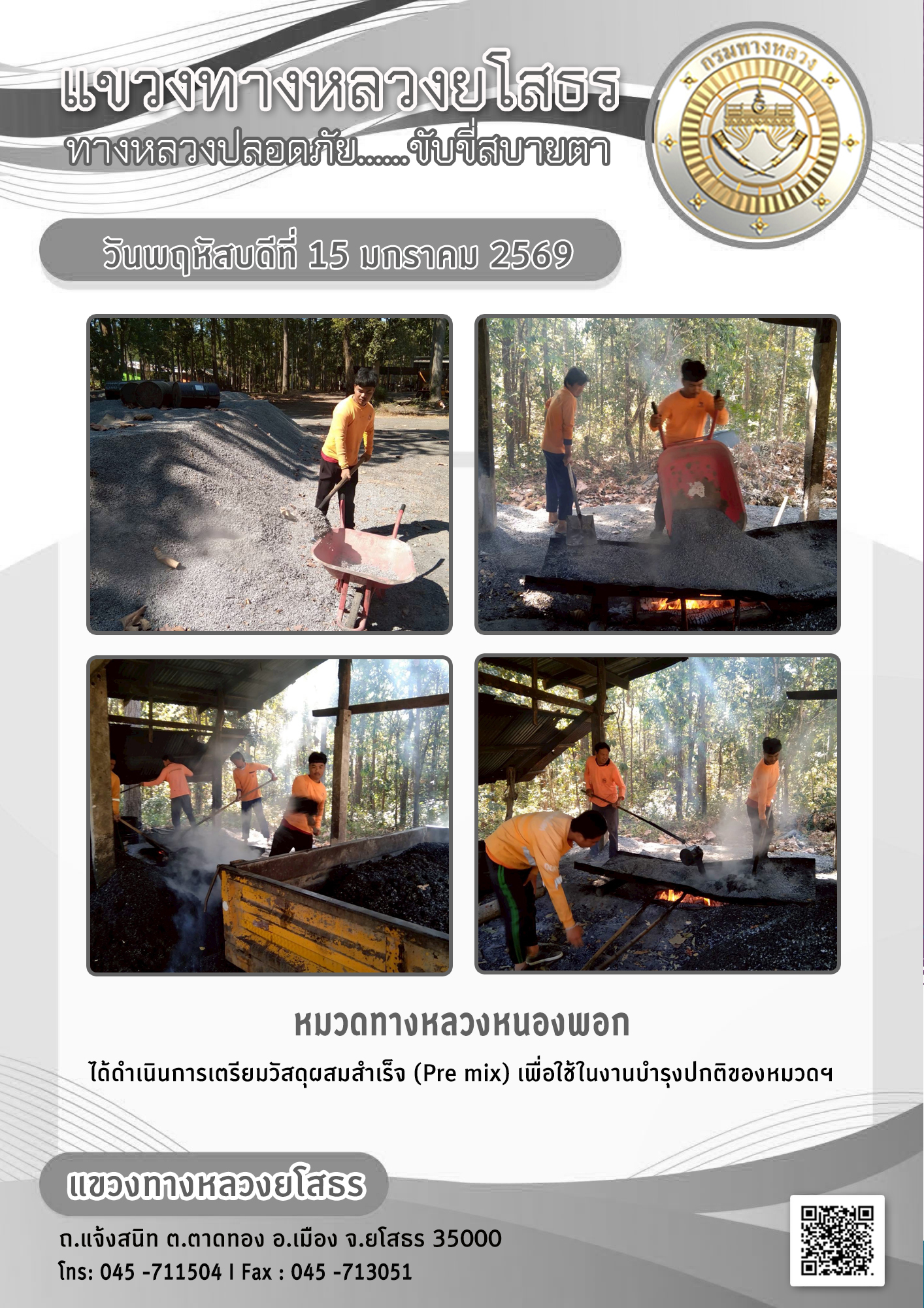 วันพฤหัสบดีที่ 15 มกราคม 2569 หมวดทางหลวงหนองพอก ได้ดำเนินการเตรียมวัสดุผสมสำเร็จ (Pre mix) เพื่อใช้ในงานบำรุงปกติของหมวดฯ