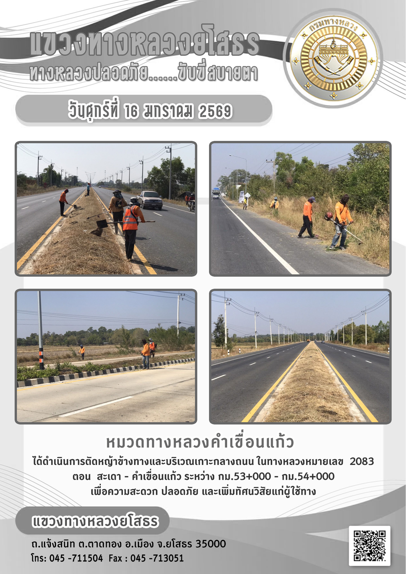 วันศุกร์ที่ 16 มกราคม 2569 หมวดทางหลวงคำเขื่อนแก้ว ได้ดำเนินการตัดหญ้าข้างทางและบริเวณเกาะกลางถนน ในทางหลวงหมายเลข 2083 ตอน สะเดา - คำเขื่อนแก้ว ระหว่าง กม.53+000 - กม.54+000 เพื่อความสะดวก ปลอดภัย และเพิ่มทัศนวิสัยแก่ผู้ใช้ทาง