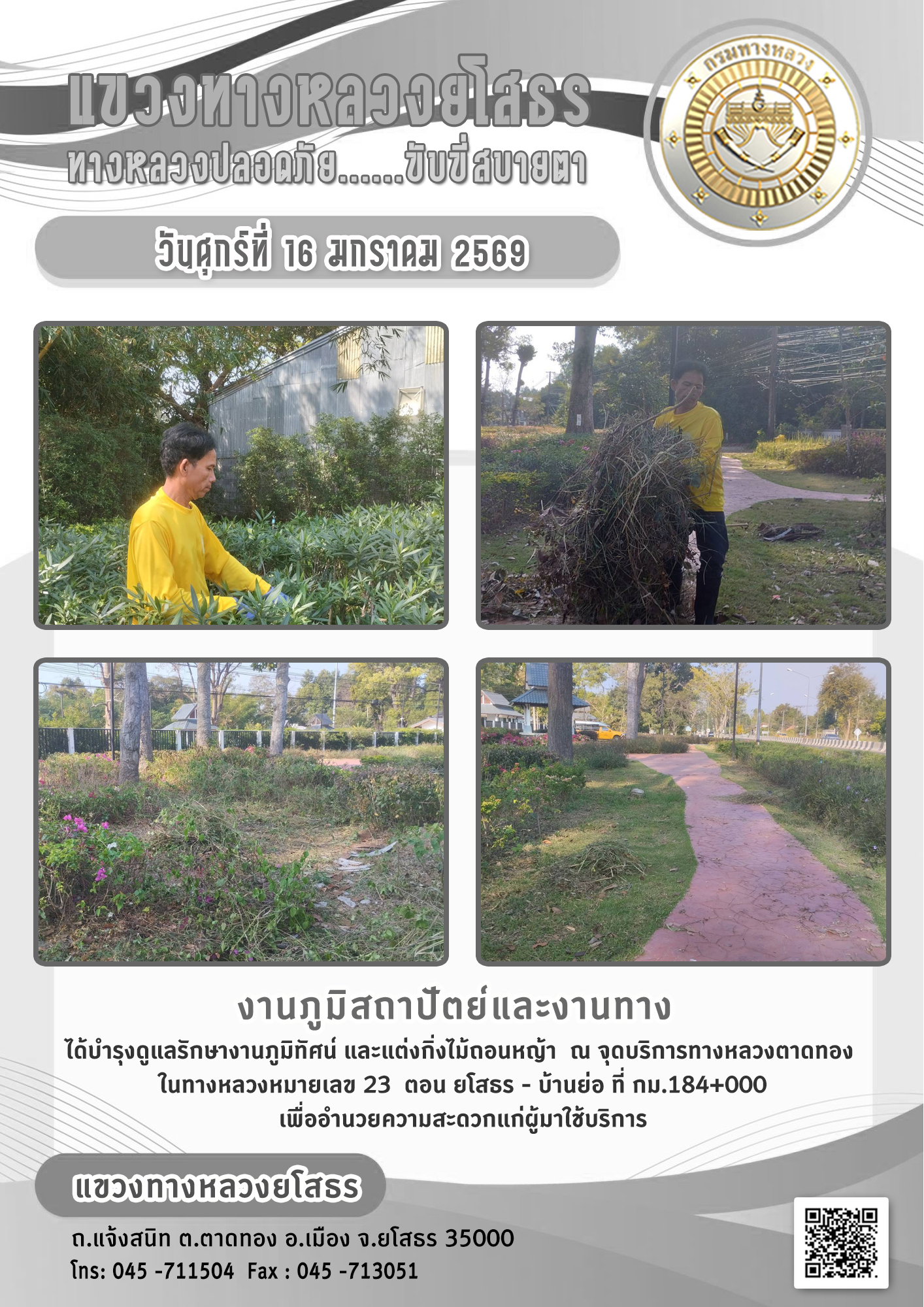 วันศุกร์ที่ 16 มกราคม 2569 งานภูมิสถาปัตย์และงานทาง ได้บำรุงดูแลรักษางานภูมิทัศน์ และตัดแต่งกิ่งไม้ถอนหญ้า ณ จุดบริการทางหลวงตาดทอง ในทางหลวงหมายเลข 23 ตอน ยโสธร - บ้านย่อ ที่ กม.184+000 เพื่ออำนวยความสะดวกแก่ผู้มาใช้บริการ
