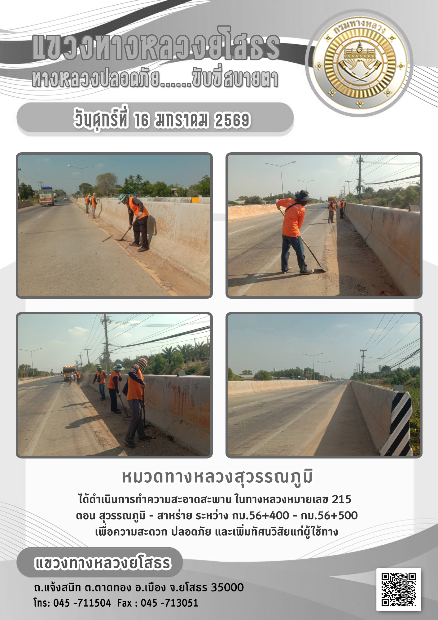 วันศุกร์ที่ 16 มกราคม 2569 หมวดทางหลวงสุวรรณภูมิ ได้ดำเนินการทำความสะอาดสะพาน ในทางหลวงหมายเลข 215 ตอน สุวรรณภูมิ - สาหร่าย ระหว่าง กม.56+400 - กม.56+500 เพื่อความสะดวก ปลอดภัย และเพิ่มทัศนวิสัยแก่ผู้ใช้ทาง
