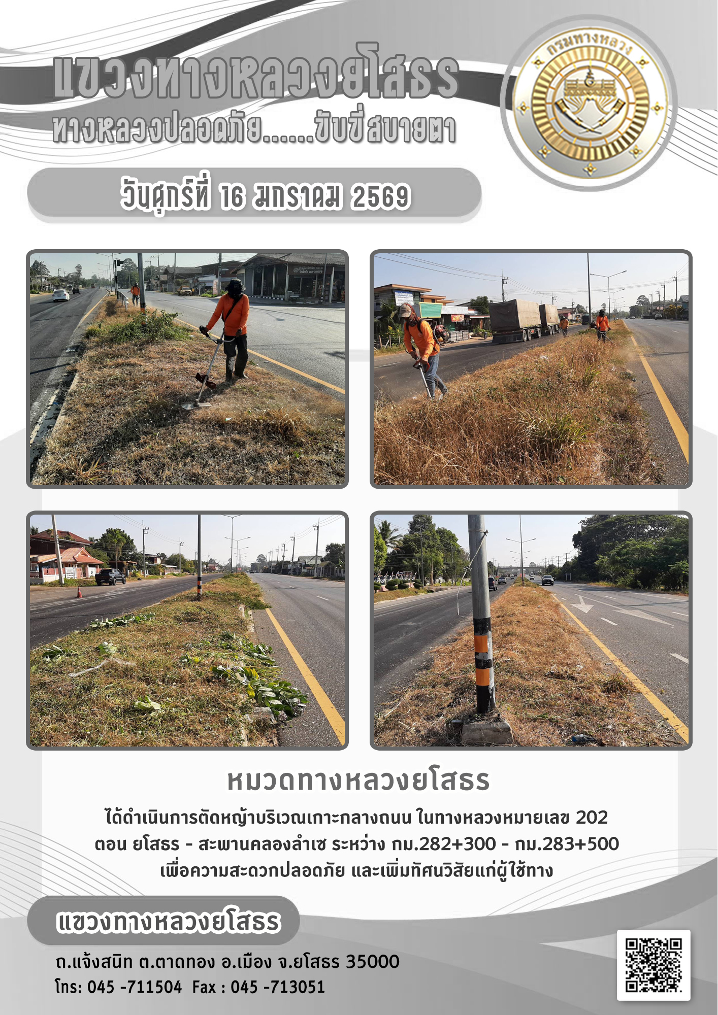 วันศุกร์ที่ 16 มกราคม 2569 หมวดทางหลวงยโสธร ได้ดำเนินการตัดหญ้าบริเวณเกาะกลางถนน ในทางหลวงหมายเลข 202 ตอน ยโสธร - สะพานคลองลำเซ ระหว่าง กม.282+300 - กม.283+500 เพื่อความสะดวกปลอดภัย และเพิ่มทัศนวิสัยแก่ผู้ใช้ทาง