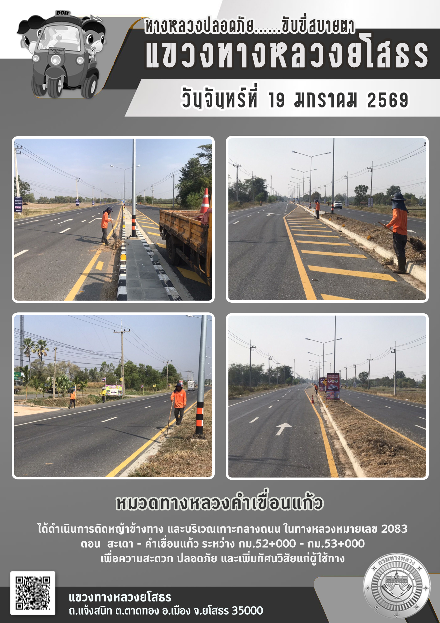 วันจันทร์ที่ 19 มกราคม 2569 หมวดทางหลวงคำเขื่อนแก้ว ได้ดำเนินการตัดหญ้าข้างทาง และบริเวณเกาะกลางถนน ในทางหลวงหมายเลข 2083 ตอน สะเดา - คำเขื่อนแก้ว ระหว่าง กม.52+000 - กม.53+000 เพื่อความสะดวก ปลอดภัย และเพิ่มทัศนวิสัยแก่ผู้ใช้ทาง