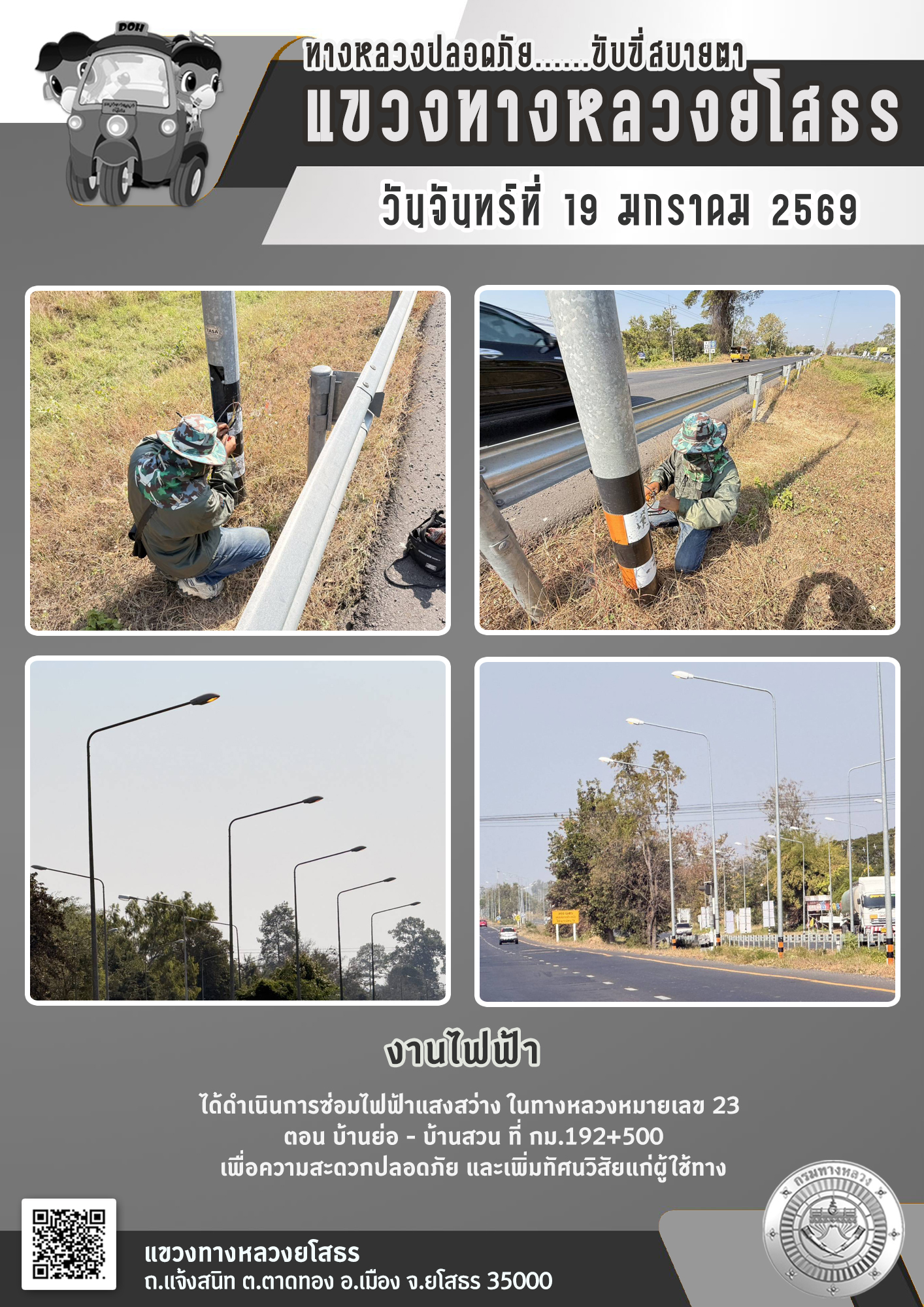 วันจันทร์ที่ 19 มกราคม 2569 งานไฟฟ้า ได้ดำเนินการซ่อมไฟฟ้าแสงสว่าง ในทางหลวงหมายเลข 23 ตอน บ้านย่อ - บ้านสวน ที่ กม.192+500 เพื่อความสะดวกปลอดภัย และเพิ่มทัศนวิสัยแก่ผู้ใช้ทาง