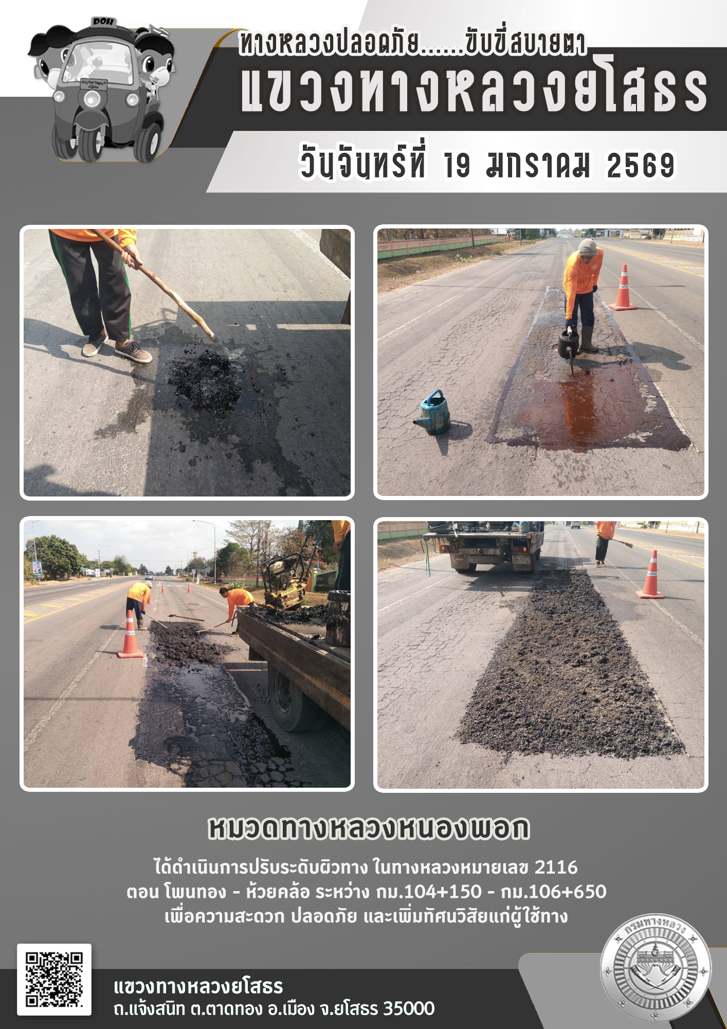 วันจันทร์ที่ 19 มกราคม 2569 หมวดทางหลวงหนองพอก ได้ดำเนินการปรับระดับผิวทาง ในทางหลวงหมายเลข 2116 ตอน โพนทอง - ห้วยคล้อ ระหว่าง กม.104+150 - กม.106+650 เพื่อความสะดวก ปลอดภัย และเพิ่มทัศนวิสัยแก่ผู้ใช้ทาง