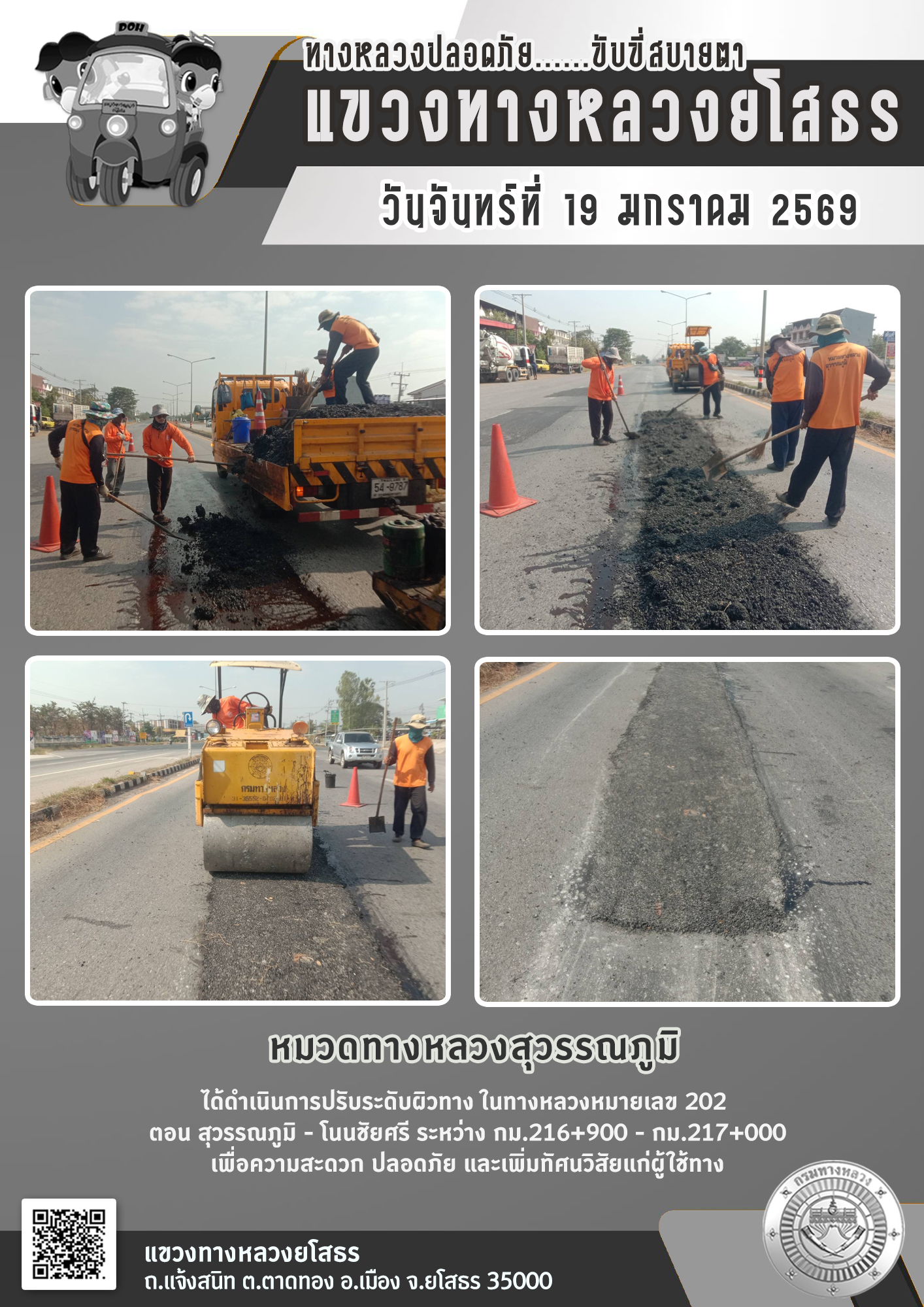 วันจันทร์ที่ 19 มกราคม 2569 หมวดทางหลวงสุวรรณภูมิ ได้ดำเนินการปรับระดับผิวทาง ในทางหลวงหมายเลข 202 ตอน สุวรรณภูมิ - โนนชัยศรี ระหว่าง กม.216+900 - กม.217+000 เพื่อความสะดวก ปลอดภัย และเพิ่มทัศนวิสัยแก่ผู้ใช้ทาง