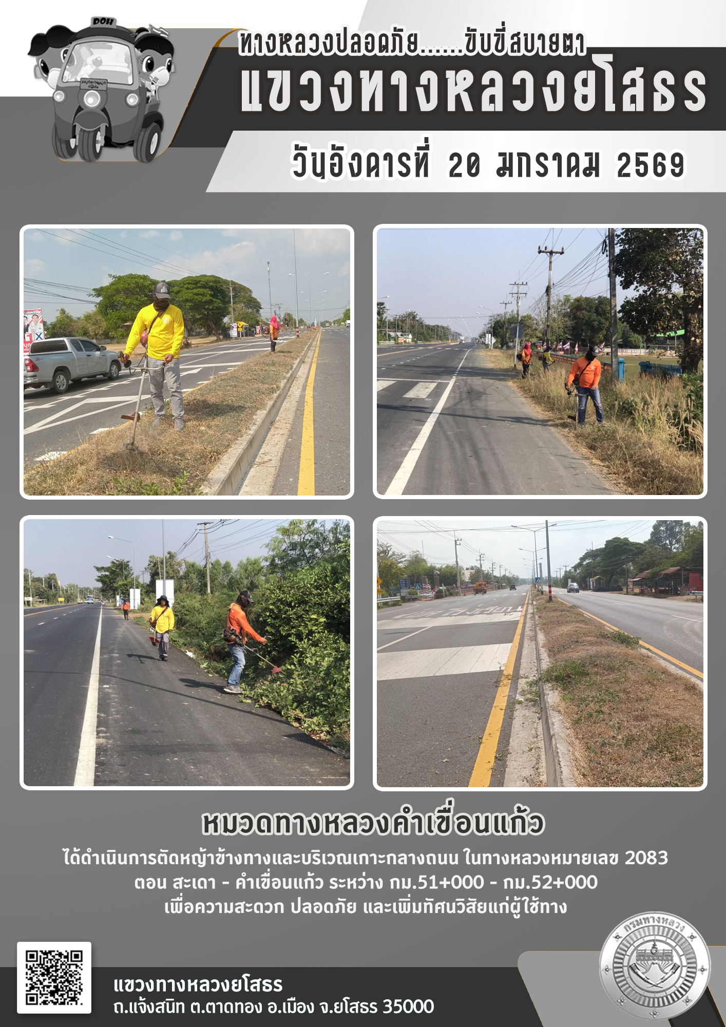 วันอังคารที่ 20 มกราคม 2569 หมวดทางหลวงคำเขื่อนแก้ว ได้ดำเนินการตัดหญ้าข้างทางและบริเวณเกาะกลางถนน ในทางหลวงหมายเลข 2083 ตอน สะเดา - คำเขื่อนแก้ว ระหว่าง กม.51+000 - กม.52+000 เพื่อความสะดวก ปลอดภัย และเพิ่มทัศนวิสัยแก่ผู้ใช้ทาง