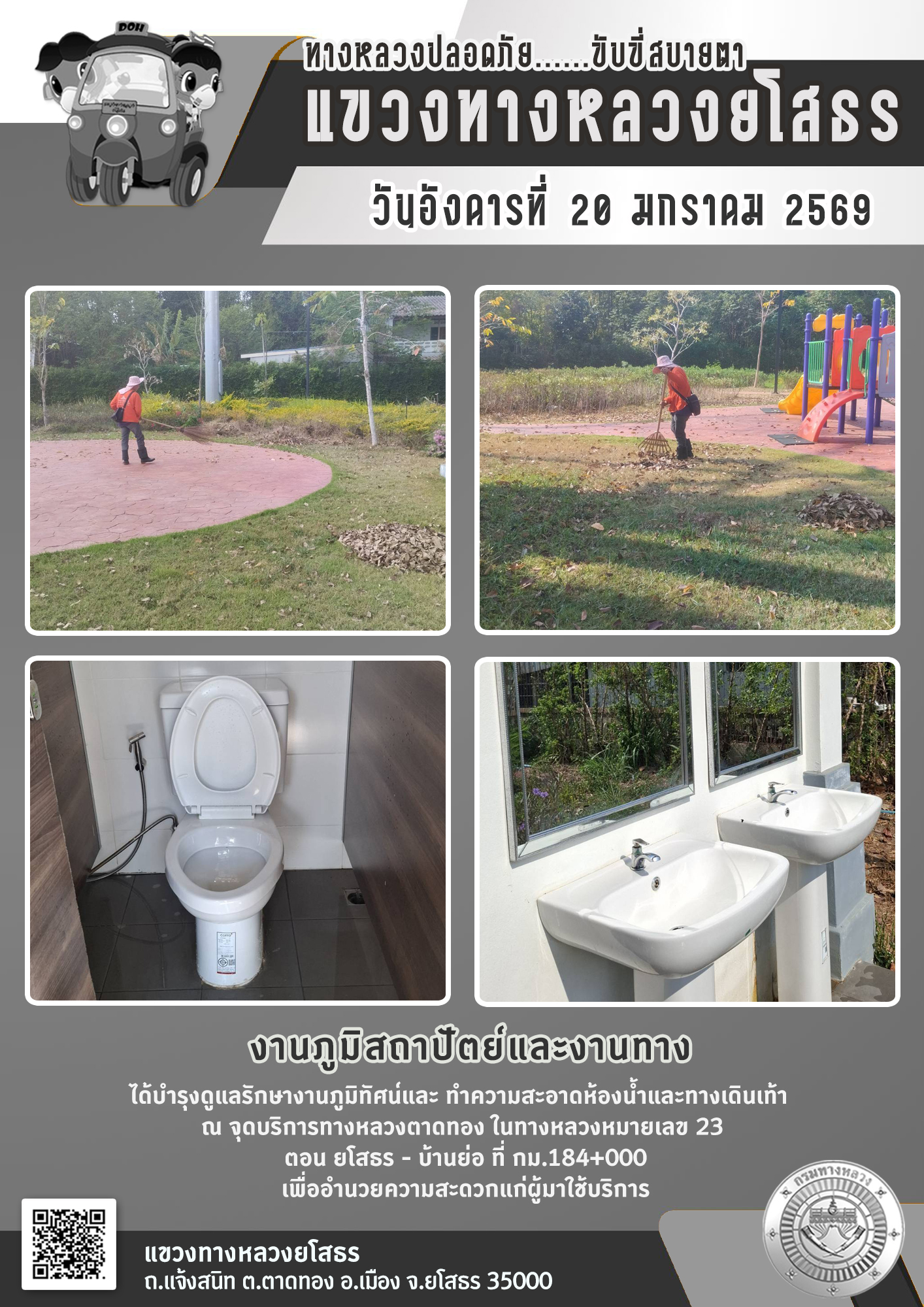 วันอังคารที่ 20 มกราคม 2569 งานภูมิสถาปัตย์และงานทาง ได้บำรุงดูแลรักษางานภูมิทัศน์และทำความสะอาดห้องน้ำและทางเดินเท้า ณ จุดบริการทางหลวงตาดทอง ในทางหลวงหมายเลข 23 ตอน ยโสธร - บ้านย่อ ที่ กม.184+000 เพื่ออำนวยความสะดวกแก่ผู้มาใช้บริการ