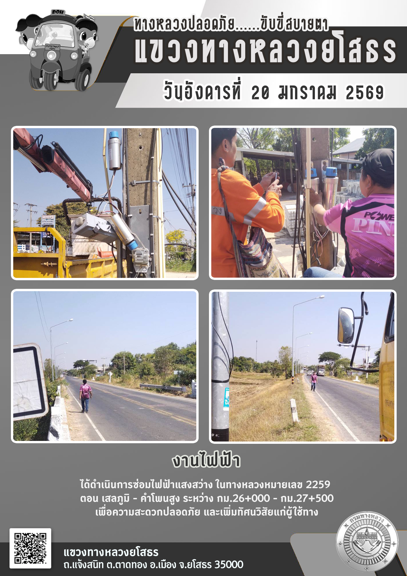 วันอังคารที่ 20 มกราคม 2569 งานไฟฟ้า ได้ดำเนินการซ่อมไฟฟ้าแสงสว่าง ในทางหลวงหมายเลข 2259 ตอน เสลภูมิ - คำโพนสูง ระหว่าง กม.26+000 - กม.27+500 เพื่อความสะดวกปลอดภัย และเพิ่มทัศนวิสัยแก่ผู้ใช้ทาง