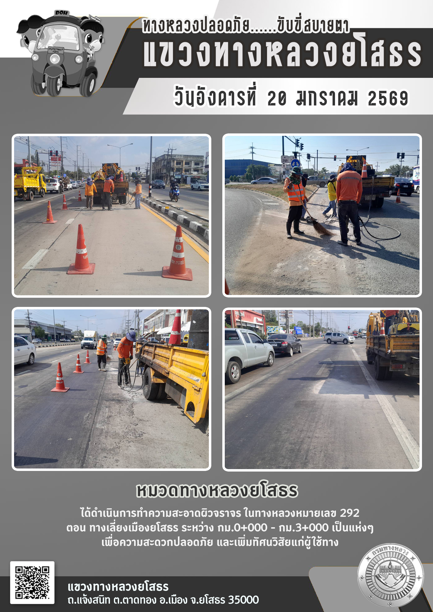 วันอังคารที่ 20 มกราคม 2569 หมวดทางหลวงยโสธร ได้ดำเนินการทำความสะอาดผิวจราจร ในทางหลวงหมายเลข 292 ตอน ทางเลี่ยงเมืองยโสธร ระหว่าง กม.0+000 - กม.3+000 เป็นแห่งๆ เพื่อความสะดวกปลอดภัย และเพิ่มทัศนวิสัยแก่ผู้ใช้ทาง