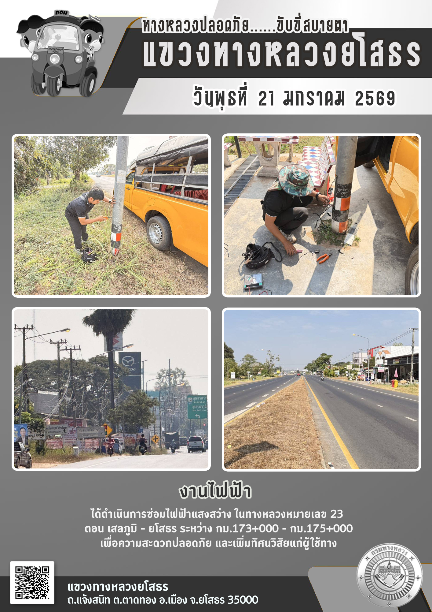 วันพุธที่ 21 มกราคม 2569 งานไฟฟ้า ได้ดำเนินการซ่อมไฟฟ้าแสงสว่าง ในทางหลวงหมายเลข 23 ตอน เสลภูมิ - ยโสธร ระหว่าง กม.173+000 - กม.175+000 เพื่อความสะดวกปลอดภัย และเพิ่มทัศนวิสัยแก่ผู้ใช้ทาง