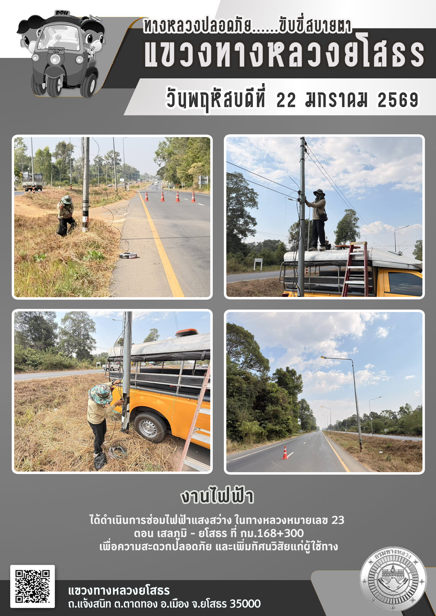 วันพฤหัสบดีที่ 22 มกราคม 2569 งานไฟฟ้า ได้ดำเนินการซ่อมไฟฟ้าแสงสว่าง ในทางหลวงหมายเลข 23 ตอน เสลภูมิ - ยโสธร ที่ กม.168+300 เพื่อความสะดวกปลอดภัย และเพิ่มทัศนวิสัยแก่ผู้ใช้ทาง