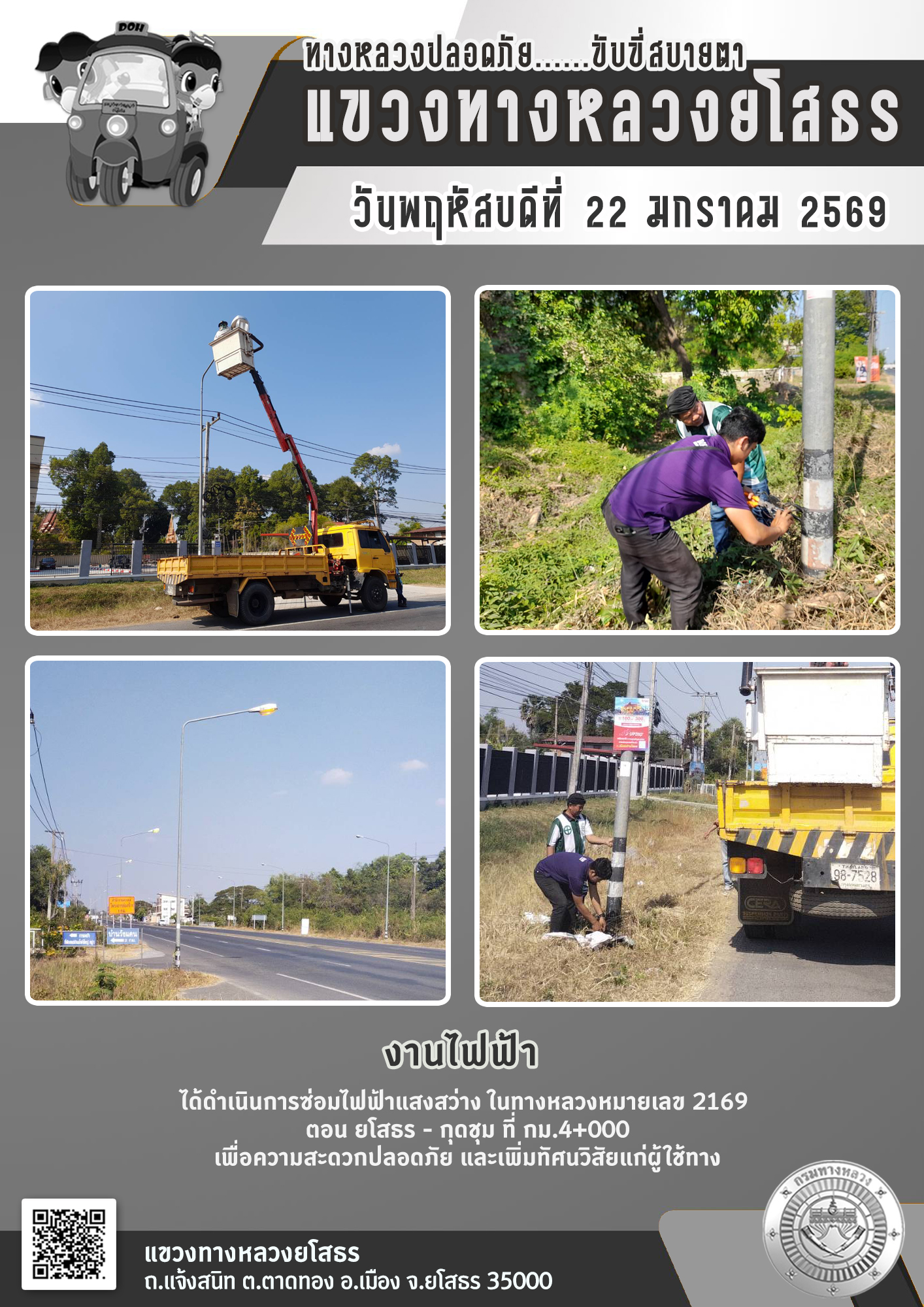 วันพฤหัสบดีที่ 22 มกราคม 2569 งานไฟฟ้า ได้ดำเนินการซ่อมไฟฟ้าแสงสว่าง ในทางหลวงหมายเลข 2169 ตอน ยโสธร - กุดชุม ที่ กม.4+000 เพื่อความสะดวกปลอดภัย และเพิ่มทัศนวิสัยแก่ผู้ใช้ทาง