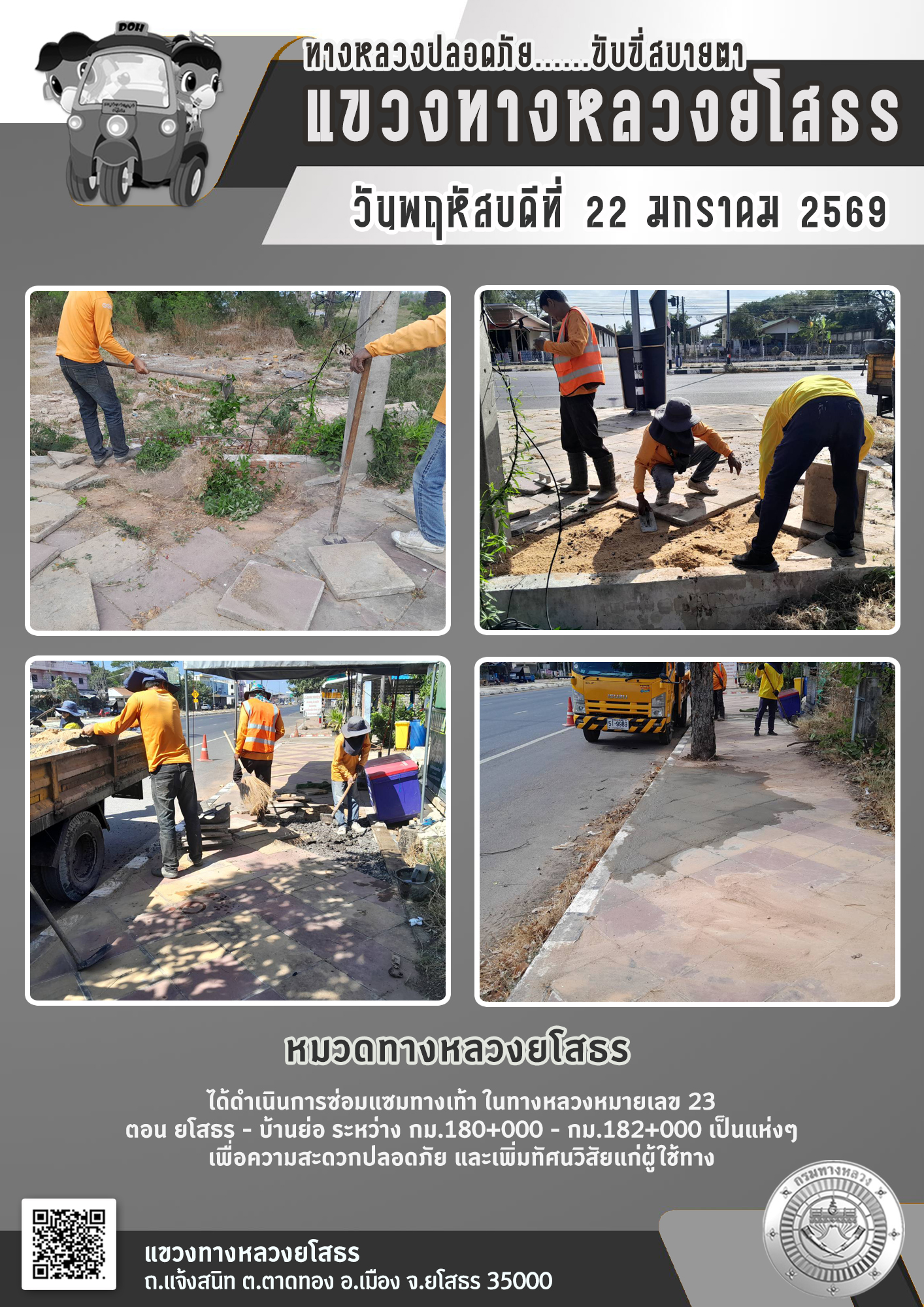 วันพฤหัสบดีที่ 22 มกราคม 2569 หมวดทางหลวงยโสธร ได้ดำเนินการซ่อมแซมทางเท้า ในทางหลวงหมายเลข 23 ตอน ยโสธร - บ้านย่อ ระหว่าง กม.180+000 - กม.182+000 เป็นแห่งๆ เพื่อความสะดวกปลอดภัย และเพิ่มทัศนวิสัยแก่ผู้ใช้ทาง