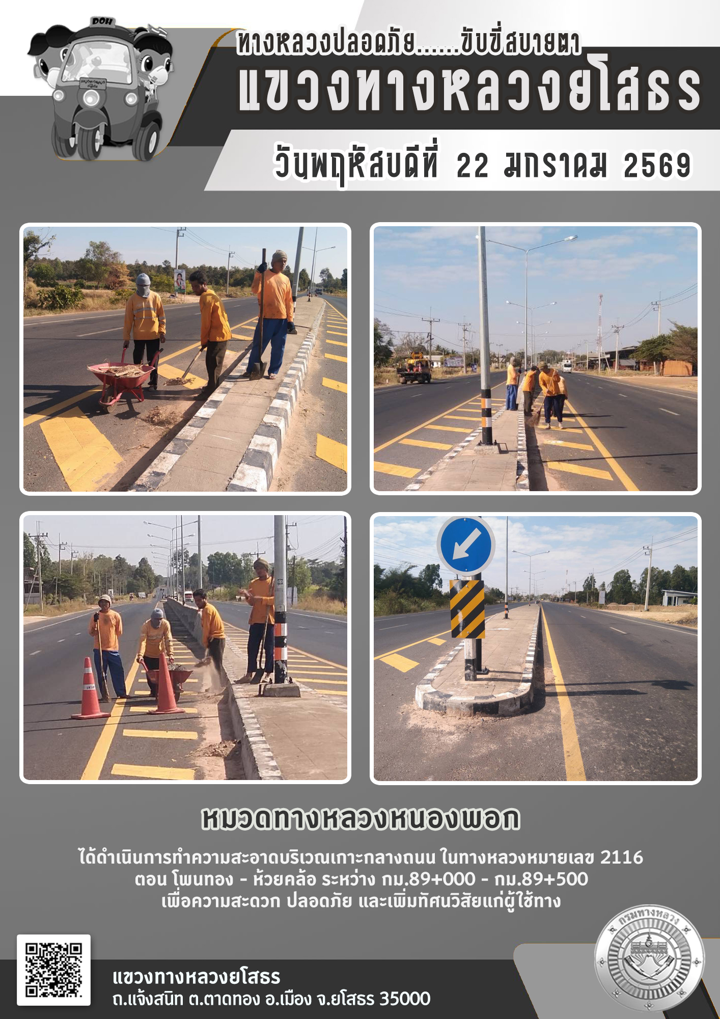 วันพฤหัสบดีที่ 22 มกราคม 2569 หมวดทางหลวงหนองพอก ได้ดำเนินการทำความสะอาดบริเวณเกาะกลางถนน ในทางหลวงหมายเลข 2116 ตอน โพนทอง - ห้วยคล้อ ระหว่าง กม.89+000 - กม.89+500 เพื่อความสะดวก ปลอดภัย และเพิ่มทัศนวิสัยแก่ผู้ใช้ทาง