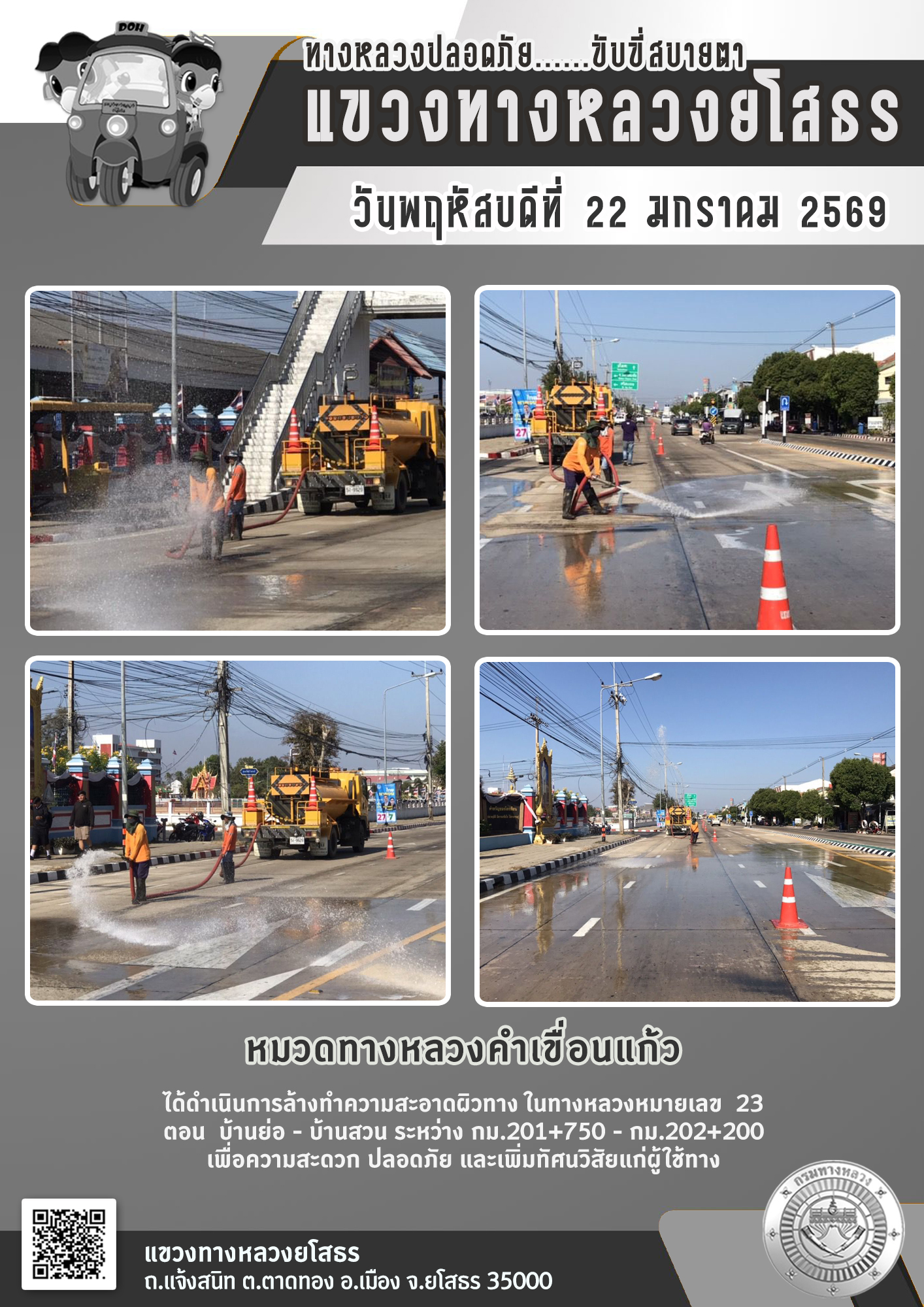วันพฤหัสบดีที่ 22 มกราคม 2569 หมวดทางหลวงคำเขื่อนแก้ว ได้ดำเนินการล้างทำความสะอาดผิวทาง ในทางหลวงหมายเลข 23 ตอน บ้านย่อ - บ้านสวน ระหว่าง กม.201+750 - กม.202+200 เพื่อความสะดวก ปลอดภัย และเพิ่มทัศนวิสัยแก่ผู้ใช้ทาง
