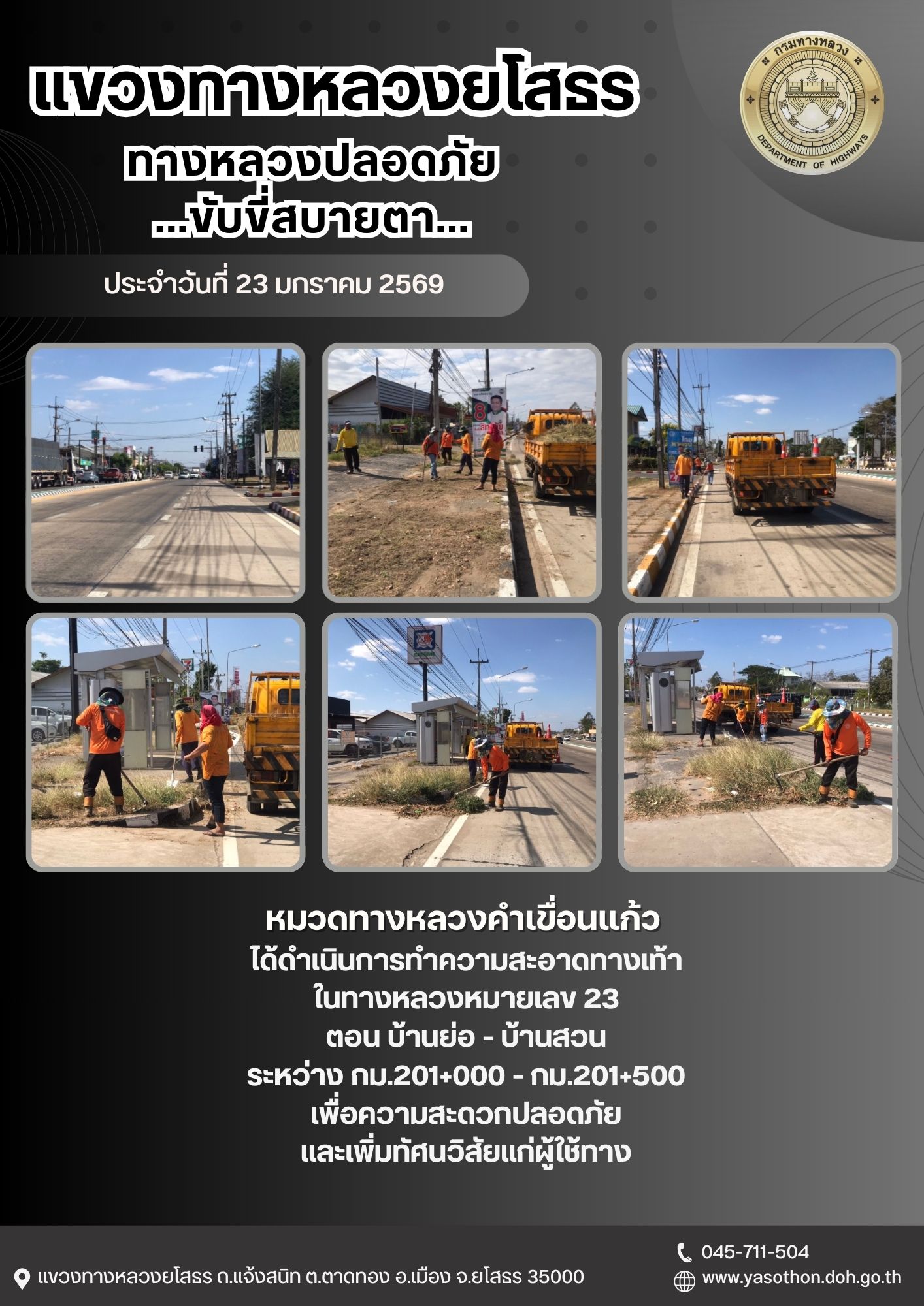 วันที่ 23 มกราคม 2569 หมวดทางหลวงคำเขื่อนแก้ว ได้ดำเนินการทำความสะอาดทางเท้า ในทางหลวงหมายเลข 23 ตอน บ้านย่อ - บ้านสวน ระหว่าง กม.201+000 - กม.201+500 เพื่อความสะดวกปลอดภัย และเพิ่มทัศนวิสัยแก่ผู้ใช้ทาง