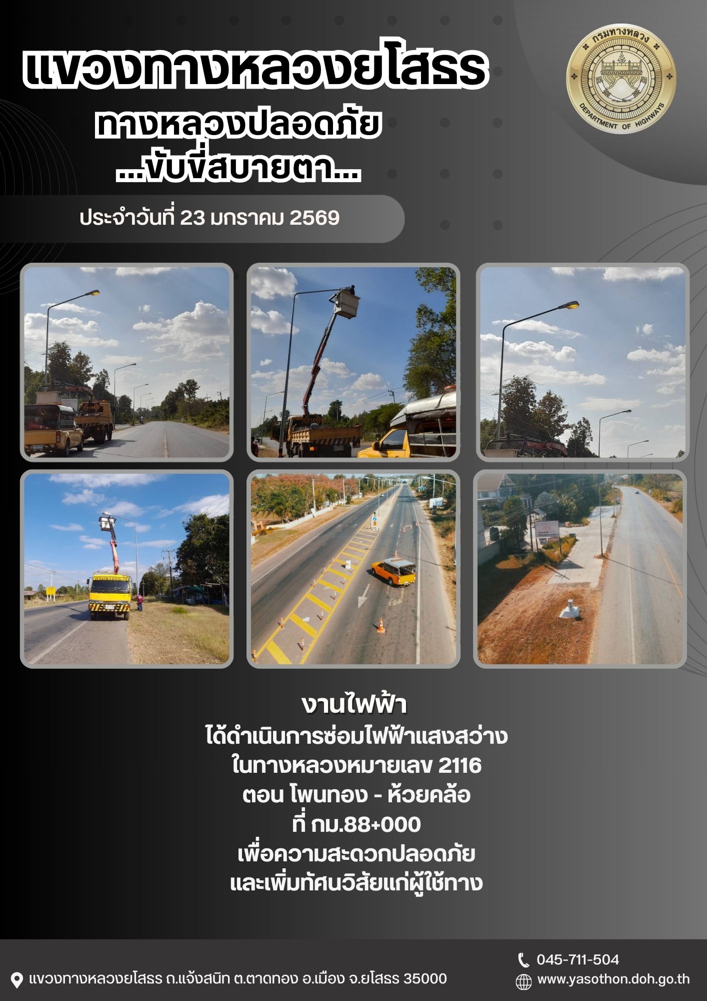 วันที่ 23 มกราคม 2569 งานไฟฟ้า ได้ดำเนินการซ่อมไฟฟ้าแสงสว่าง ในทางหลวงหมายเลข 2116 ตอน โพนทอง - ห้วยคล้อ ที่ กม.88+000 เพื่อความสะดวกปลอดภัย และเพิ่มทัศนวิสัยแก่ผู้ใช้ทาง