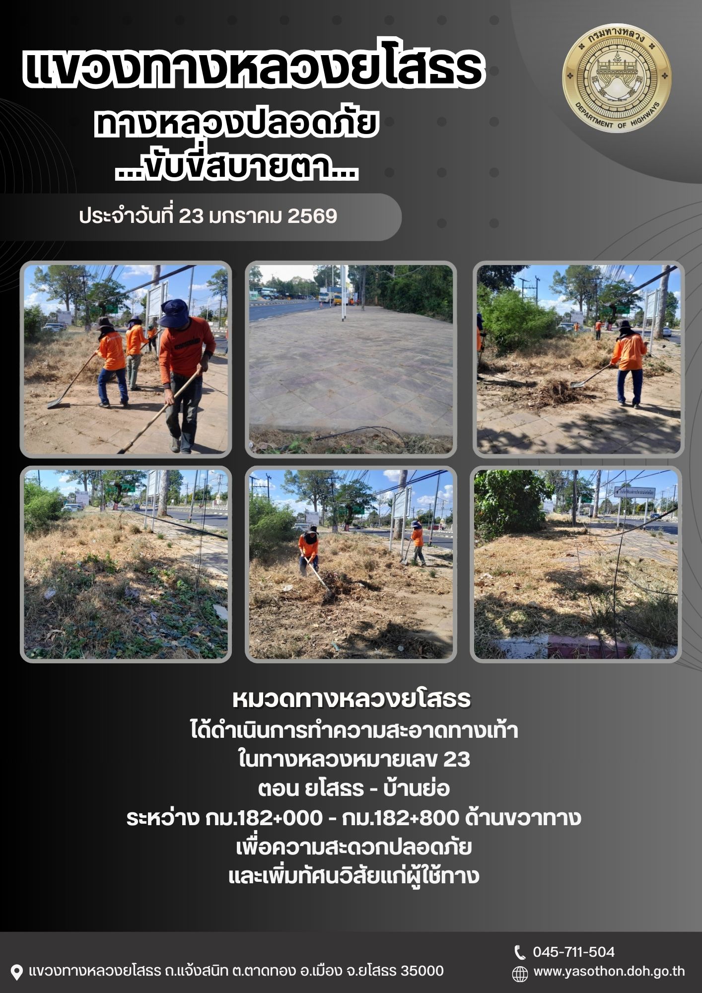 วันที่ 23 มกราคม 2569 หมวดทางหลวงยโสธร ได้ดำเนินการทำความสะอาดทางเท้า ในทางหลวงหมายเลข 23 ตอน ยโสธร - บ้านย่อ ระหว่าง กม.182+000 - กม.182+800 ด้านขวาทาง เพื่อความสะดวกปลอดภัย และเพิ่มทัศนวิสัยแก่ผู้ใช้ทาง