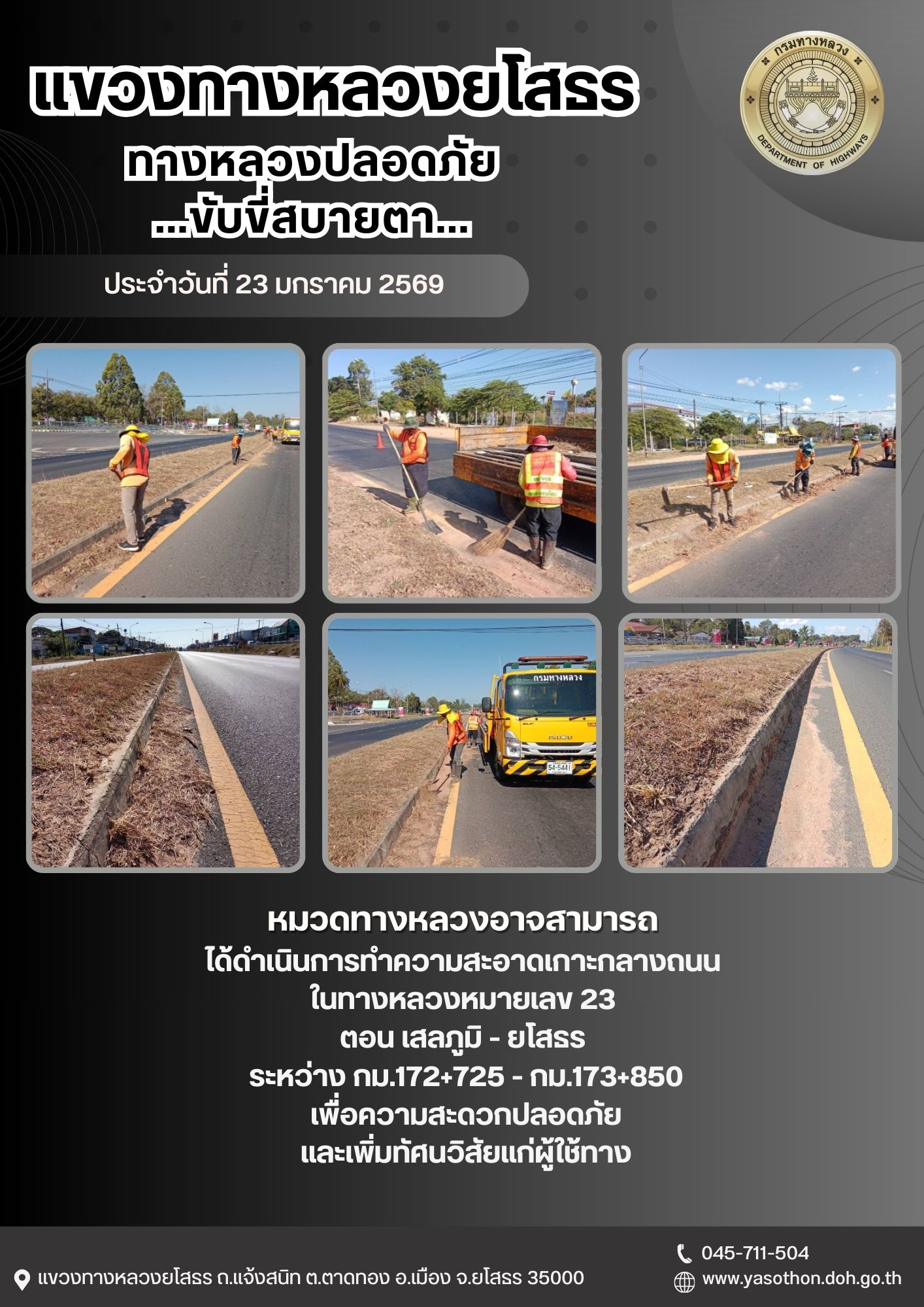 วันที่ 23 มกราคม 2569 หมวดทางหลวงอาจสามารถ ได้ดำเนินการทำความสะอาดเกาะกลางถนนน ในทางหลวงหมายเลข 23 ตอน เสลภูมิ - ยโสรร ระหว่าง กม.172+725 - กม.173+850 เพื่อความสะดวกปลอดภัย และเพิ่มทัศนวิสัยแก่ผู้ใช้ทาง