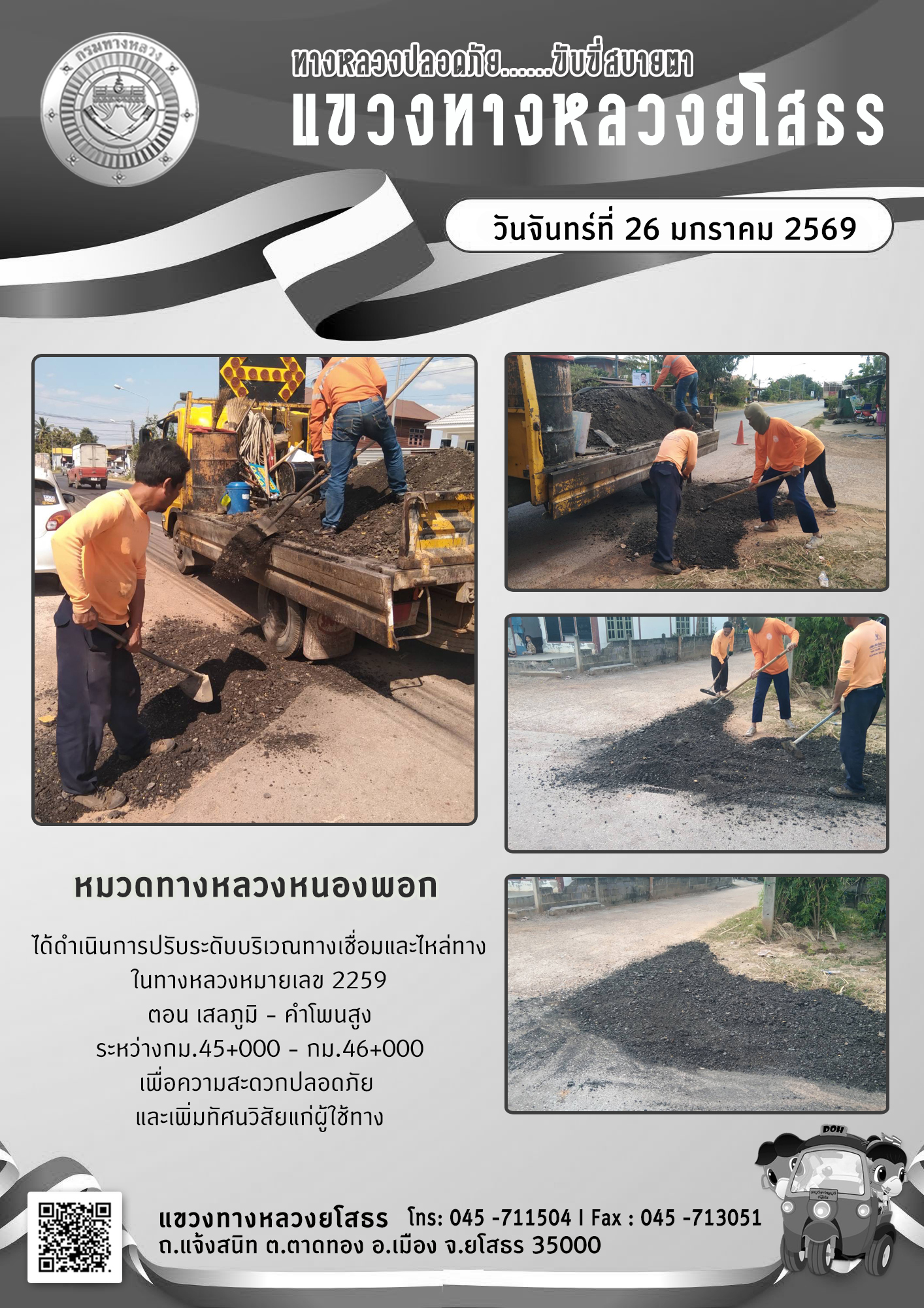 วันจันทร์ที่ 26 มกราคม 2569 หมวดทางหลวงหนองพอก ได้ดำเนินการปรับระดับบริเวณทางเชื่อมและไหล่ทาง ในทางหลวงหมายเลข 2259 ตอน เสลภูมิ - คำโพนสูง ระหว่างกม.45+000 - กม.46+000 เพื่อความสะดวกปลอดภัย