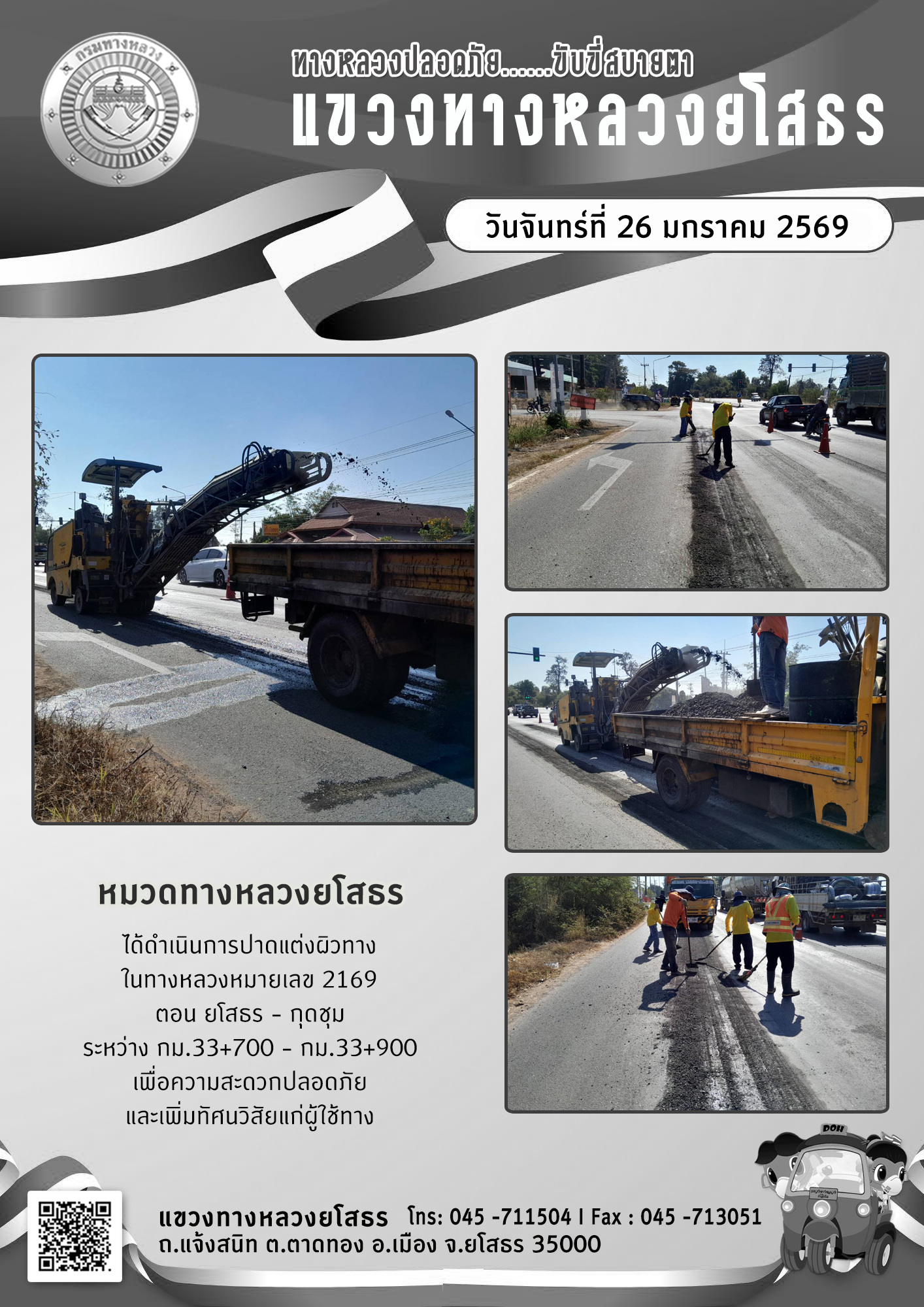 วันจันทร์ที่ 26 มกราคม 2569 หมวดทางหลวงยโสธร ได้ดำเนินการปาดแต่งผิวทาง ในทางหลวงหมายเลข 2169 ตอน ยโสธร - กุดชุม ระหว่าง กม.33+700 - กม.33+900 เพื่อความสะดวกปลอดภัย