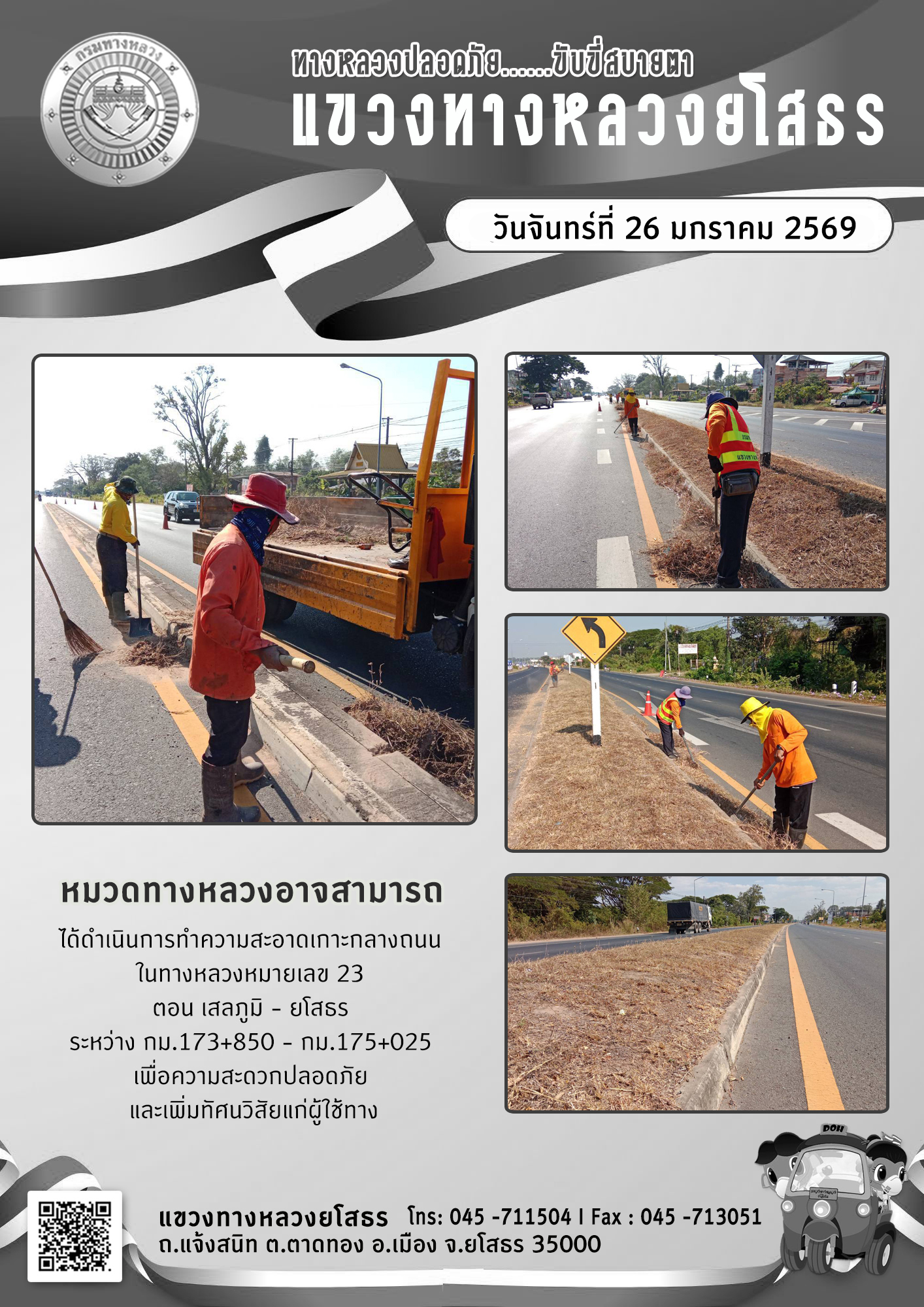 วันจันทร์ที่ 26 มกราคม 2569 หมวดทางหลวงอาจสามารถ ได้ดำเนินการทำความสะอาดเกาะกลางถนน ในทางหลวงหมายเลข 23 ตอน เสลภูมิ - ยโสธร ระหว่าง กม.173+850 - กม.175+025 เพื่อความสะดวกปลอดภัย และเพิ่มทัศนวิสัยแก่ผู้ใช้ทาง