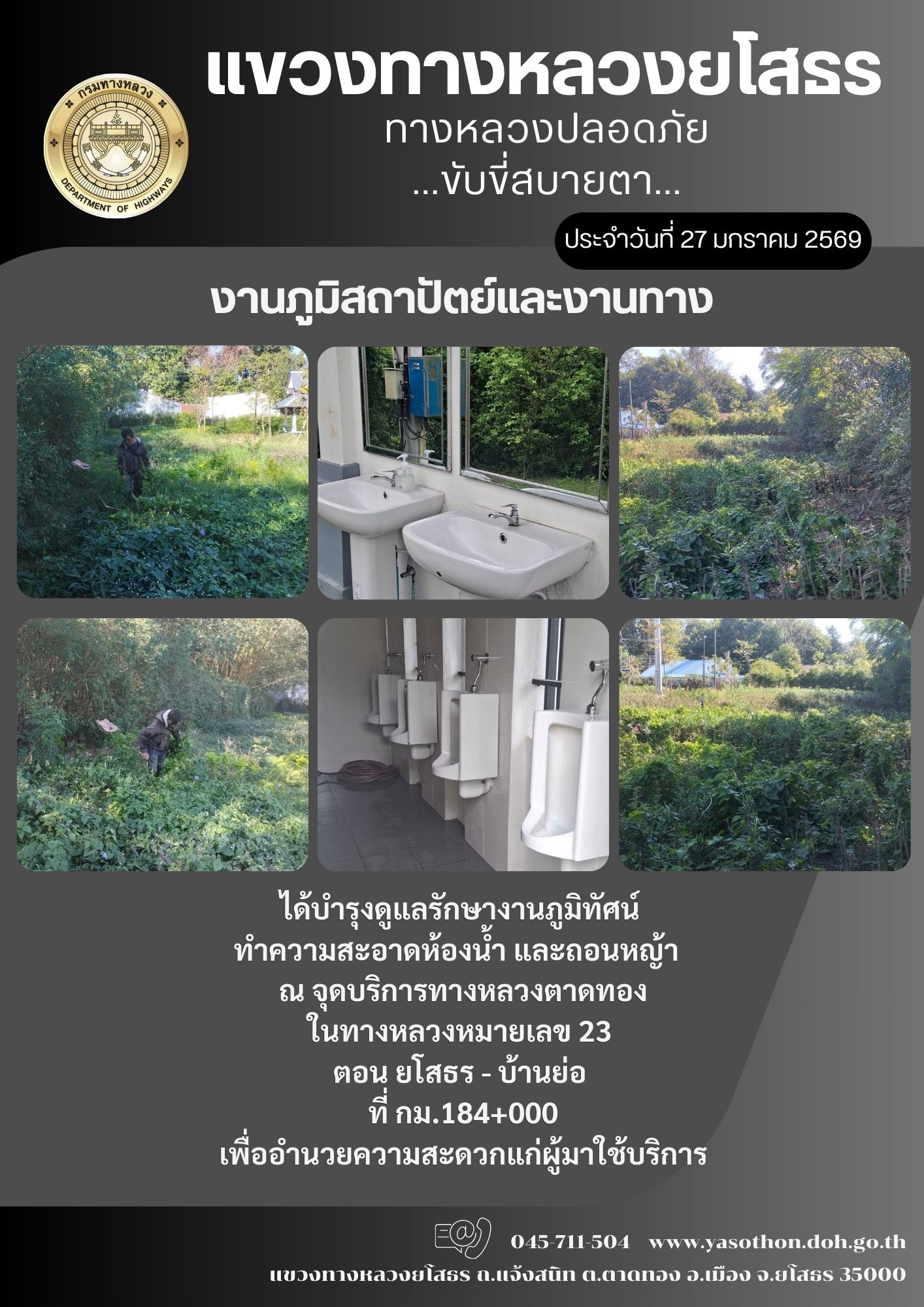 วันที่ 27 มกราคม 2569 งานภูมิสถาปัตย์และงานทาง ได้บำรุงดูแลรักษางานภูมิทัศน์ ทำความสะอาดห้องน้ำ และถอนหญ้า ณ จุดบริการทางหลวงตาดทอง ในทางหลวงหมายเลข 23 ตอน ยโสธร - บ้านย่อ ที่ กม.184+000 เพื่ออำนวยความสะดวกแก่ผู้มาใช้บริการ