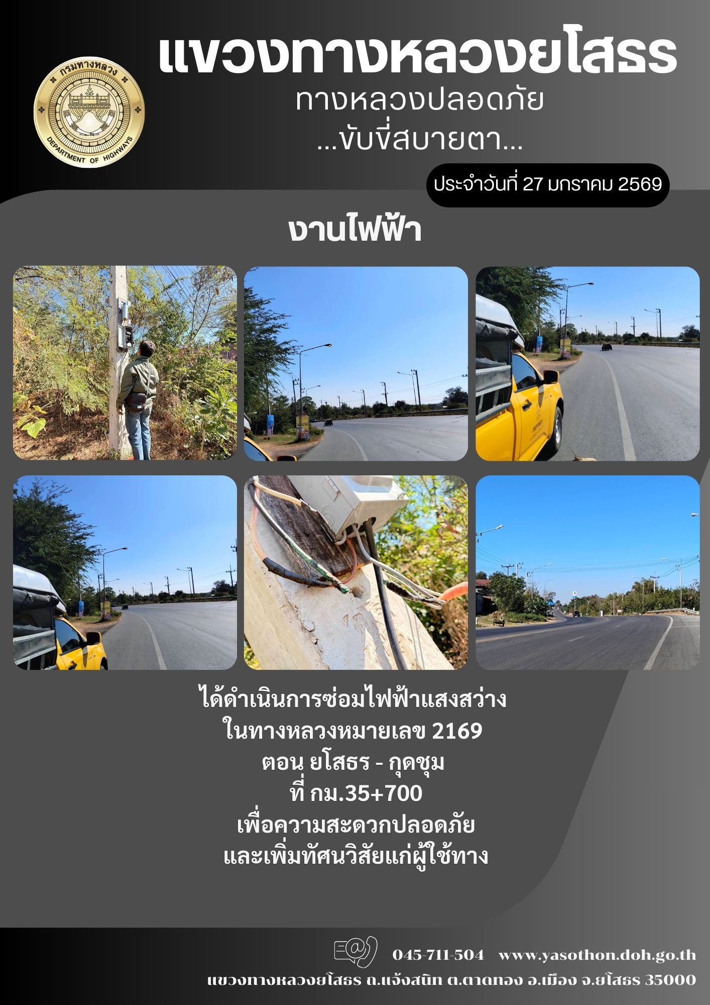 วันที่ 27 มกราคม 2569 งานไฟฟ้า ได้ดำเนินการซ่อมไฟฟ้าแสงสว่าง ในทางหลวงหมายเลข 2169 ตอน ยโสธร - กุดชุม ที่ กม.35+700 เพื่อความสะดวกปลอดภัย และเพิ่มทัศนวิสัยแก่ผู้ใช้ทาง