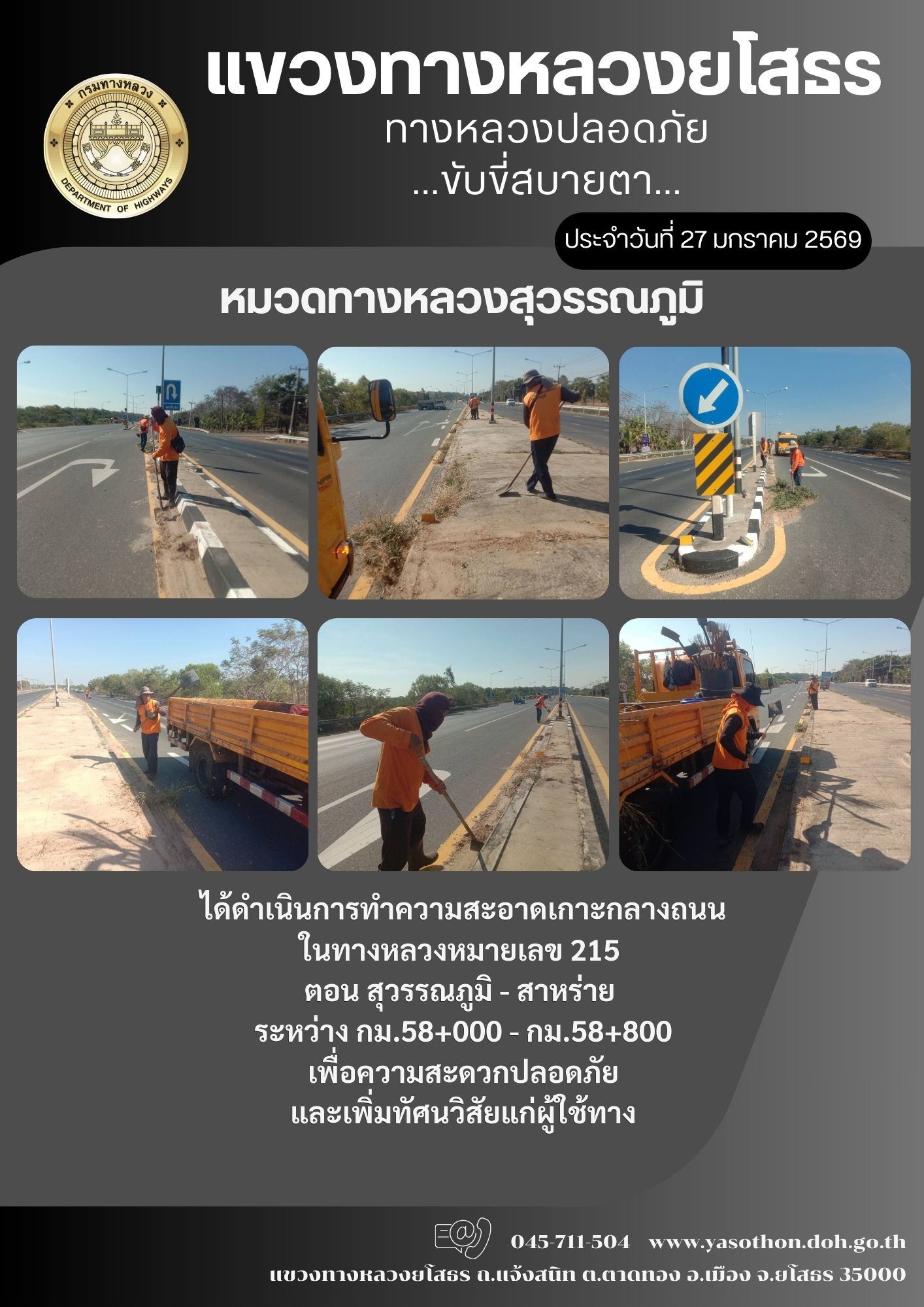 วันที่ 27 มกราคม 2569 หมวดทางหลวงสุวรรณภูมิ ได้ดำเนินการทำความสะอาดเกาะกลางถนน ในทางหลวงหมายเลข 215 ตอน สุวรรณภูมิ - สาหร่าย ระหว่าง กม.58+000 - กม.58+800 เพื่อความสะดวกปลอดภัย และเพิ่มทัศนวิสัยแก่ผู้ใช้ทาง