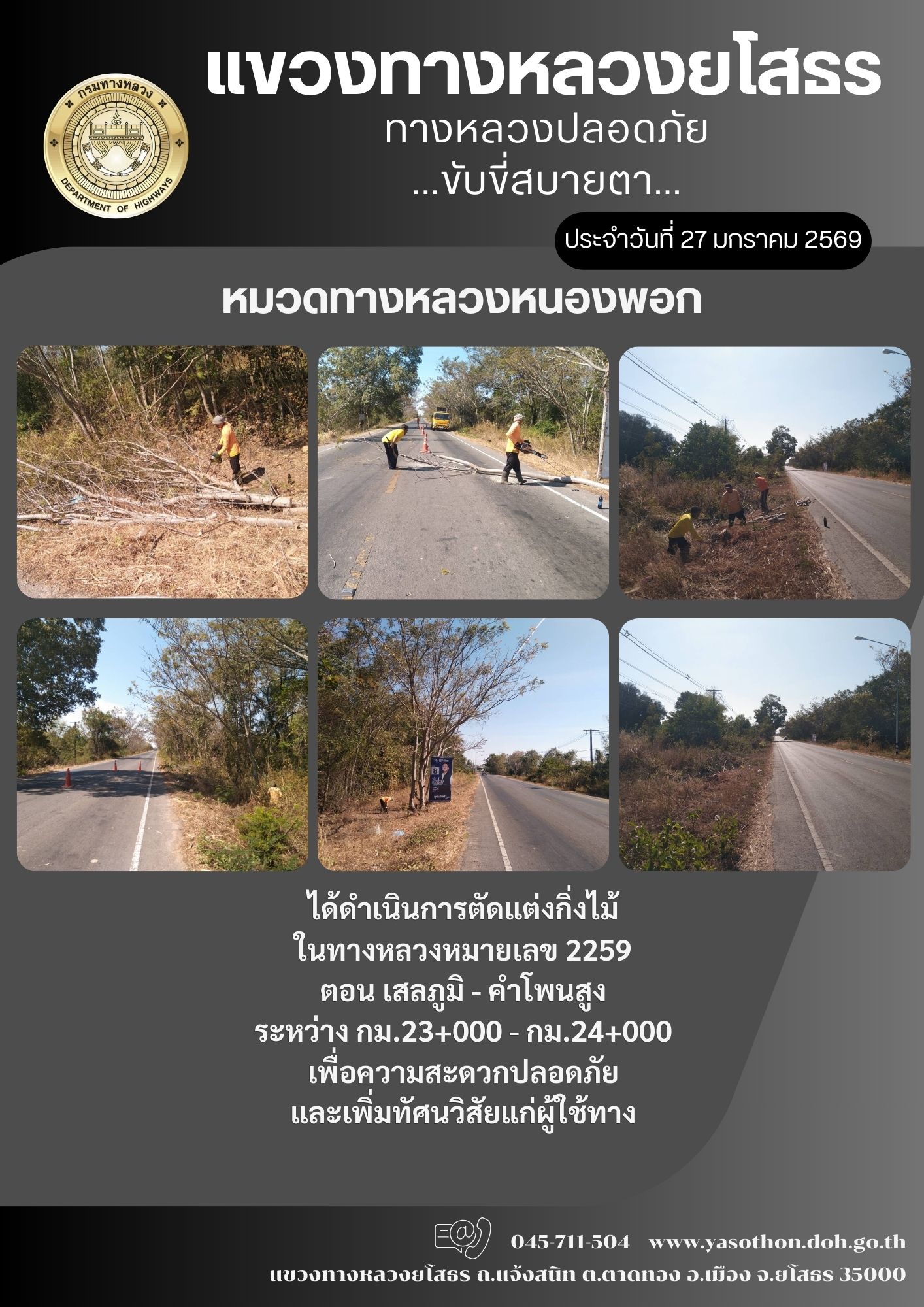 วันที่ 27 มกราคม 2569 หมวดทางหลวงหนองพอก ได้ดำเนินการตัดแต่งกิ่งไม้ ในทางหลวงหมายเลข 2259 ตอน เสลภูมิ - คำโพนสูง ระหว่าง กม.23+000 - กม.24+000 เพื่อความสะดวกปลอดภัย และเพิ่มทัศนวิสัยแก่ผู้ใช้ทาง