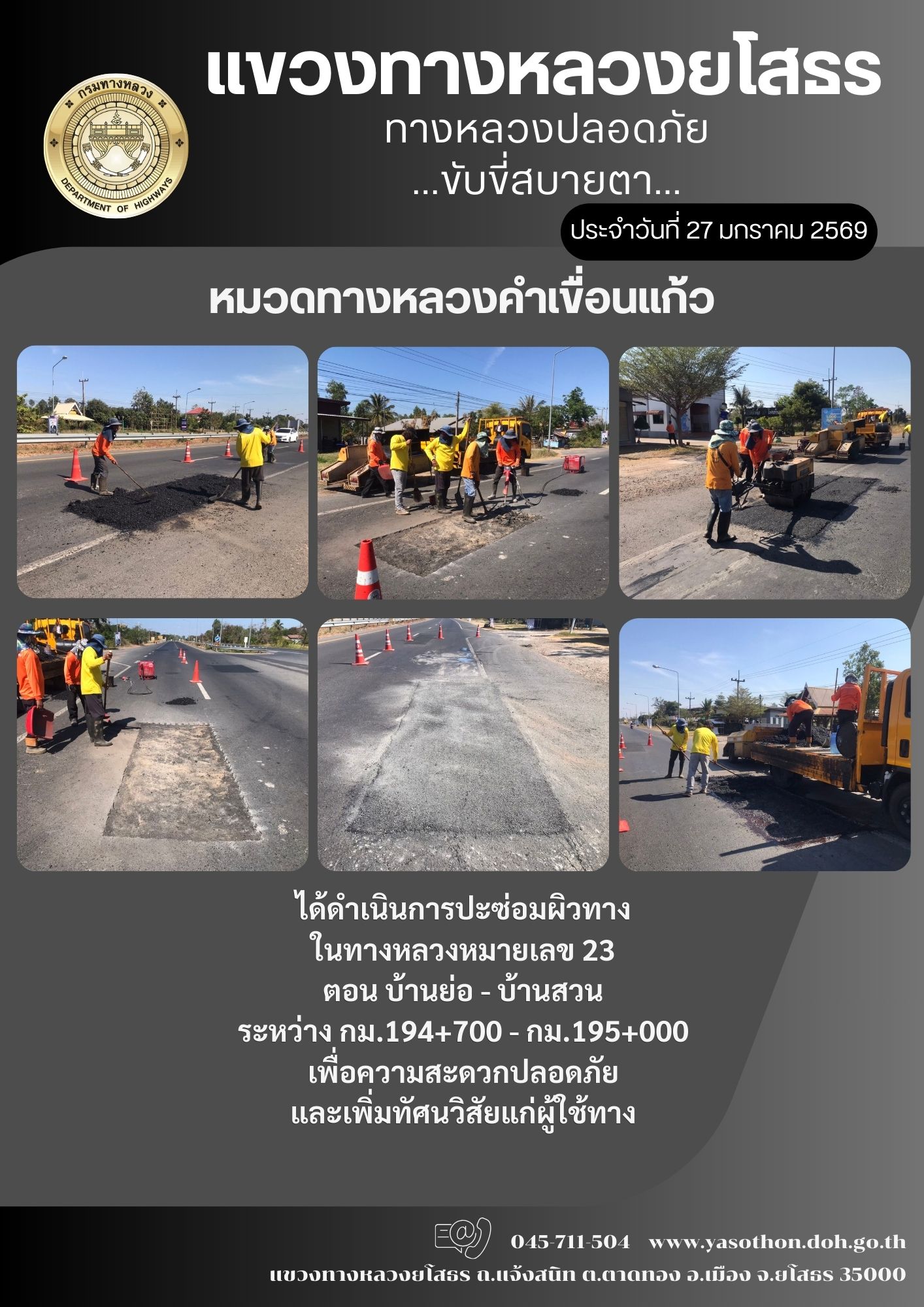 วันที่ 27 มกราคม 2569 หมวดทางหลวงคำเขื่อนแก้ว ได้ดำเนินการปะซ่อมผิวทาง ในทางหลวงหมายเลข 23 ตอน บ้านย่อ - บ้านสวน ระหว่าง กม.194+700 - กม.195+000 เพื่อความสะดวกปลอดภัย และเพิ่มทัศนวิสัยแก่ผู้ใช้ทาง