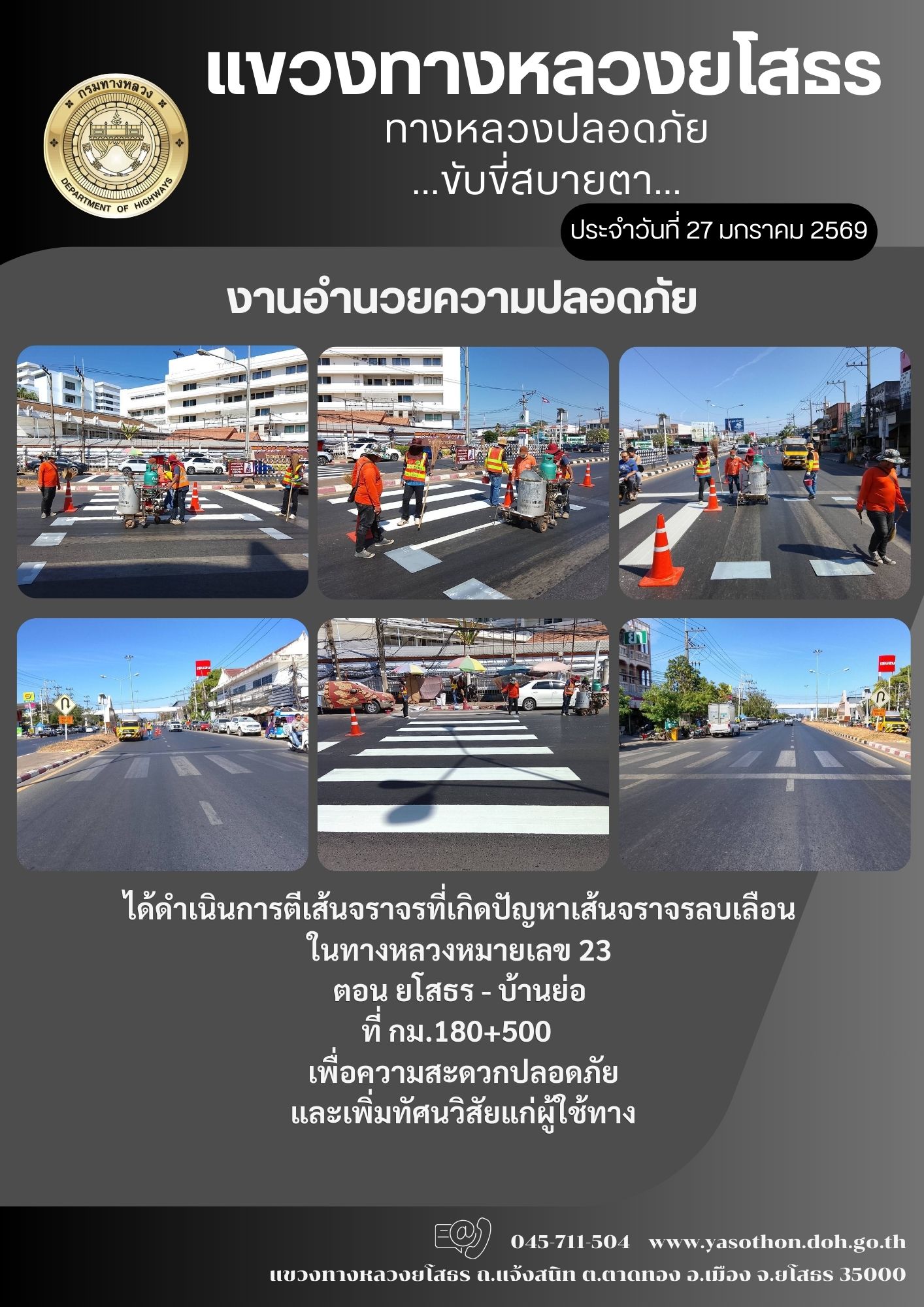 วันที่ 27 มกราคม 2569 งานอำนวยความปลอดภัย ได้ดำเนินการตีเส้นจราจรที่เกิดปัญหาเส้นจราจรลบเลือน ในทางหลวงหมายเลข 23 ตอน ยโสธร - บ้านย่อ ที่ กม.180+500 เพื่อความสะดวกปลอดภัย และเพิ่มทัศนวิสัยแก่ผู้ใช้ทาง