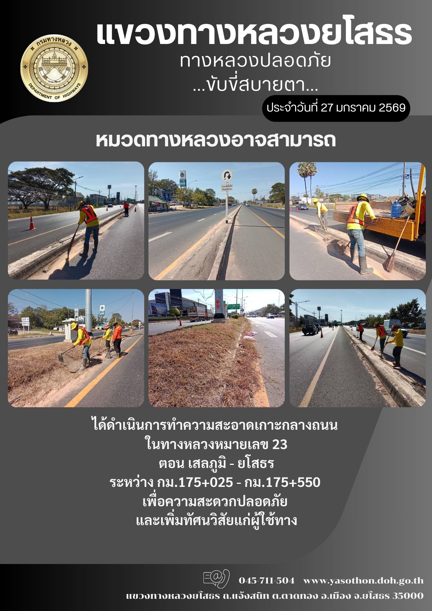 วันที่ 27 มกราคม 2569 หมวดทางหลวงอาจสามารถ ได้ดำนินการทำความสะอาดเกาะกลางถนน ในทางหลวงหมายเลข 23 ตอน เสลภูมิ - ยโสธร ระหว่าง กม.175+025 - กม.175+550 เพื่อความสะดวกปลอดภัย และเพิ่มทัศนวิสัยแก่ผู้ใช้ทาง