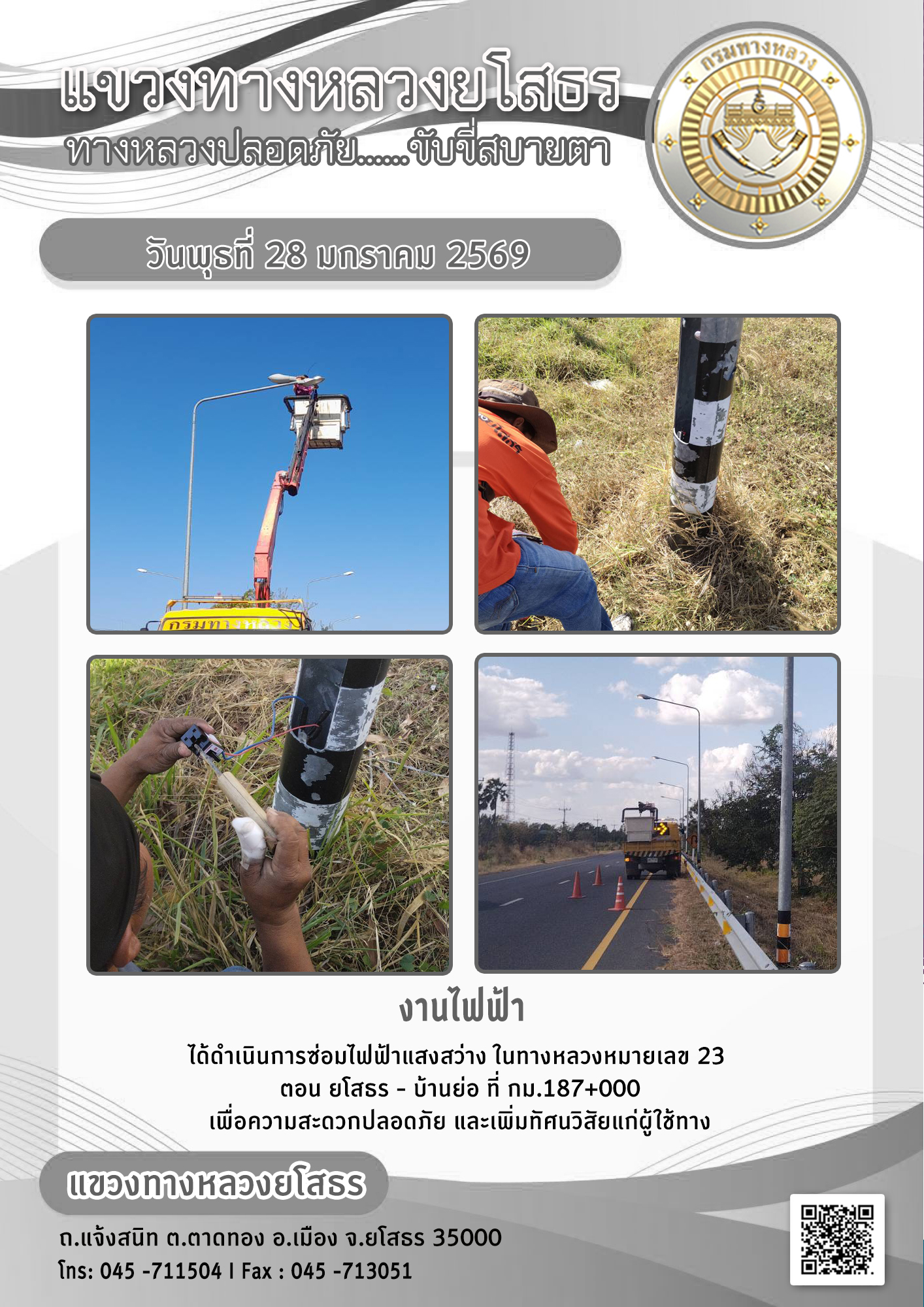 วันพุธที่ 28 มกราคม 2569 งานไฟฟ้า ได้ดำเนินการซ่อมไฟฟ้าแสงสว่าง ในทางหลวงหมายเลข 23 ตอน ยโสธร - บ้านย่อ ที่ กม.187+000 เพื่อความสะดวกปลอดภัย และเพิ่มทัศนวิสัยแก่ผู้ใช้ทาง