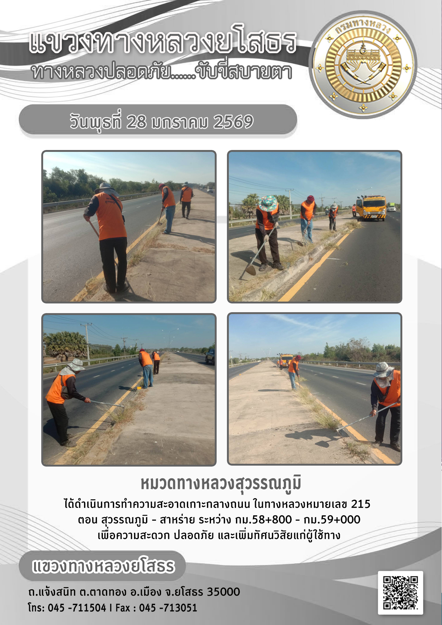 - [10:21] ทั่วไป วันอังคารที่ 31 มีนาคม 2569 งานอำนวยความปลอดภัย ได้ดำเนินการตัดหญ้า ทำความสะอาดภายในบริเวณแขวงทางหลวงยโสธร