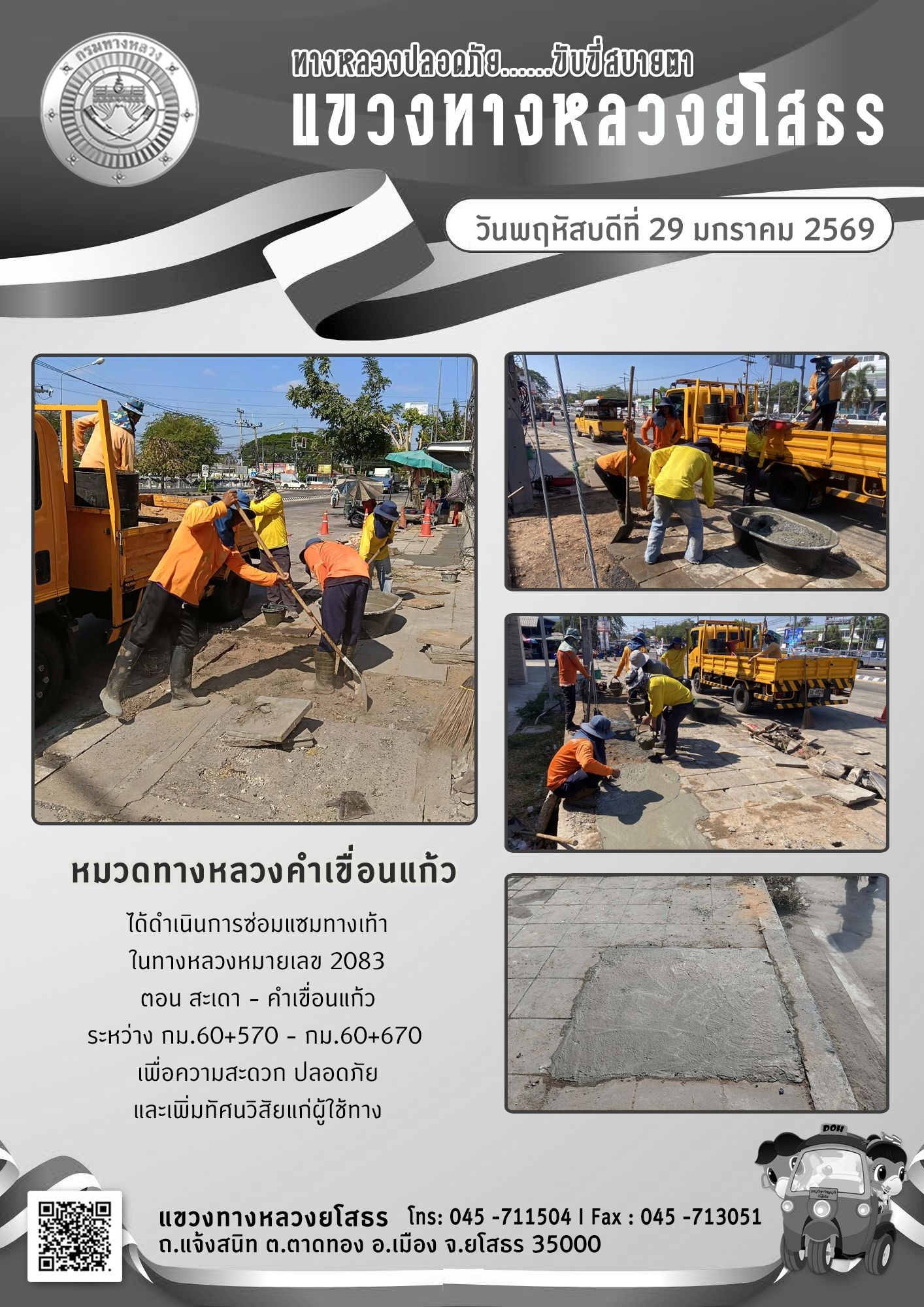วันพฤหัสบดีที่ 29 มกราคม 2569 หมวดทางหลวงคำเขื่อนแก้ว ได้ดำเนินการซ่อมแซมทางเท้า ในทางหลวงหมายเลข 2083 ตอน สะเดา - คำเขื่อนแก้ว ระหว่าง กม.60+570 - กม.60+670 เพื่อความสะดวก ปลอดภัย และเพิ่มทัศนวิสัยแก่ผู้ใช้ทาง